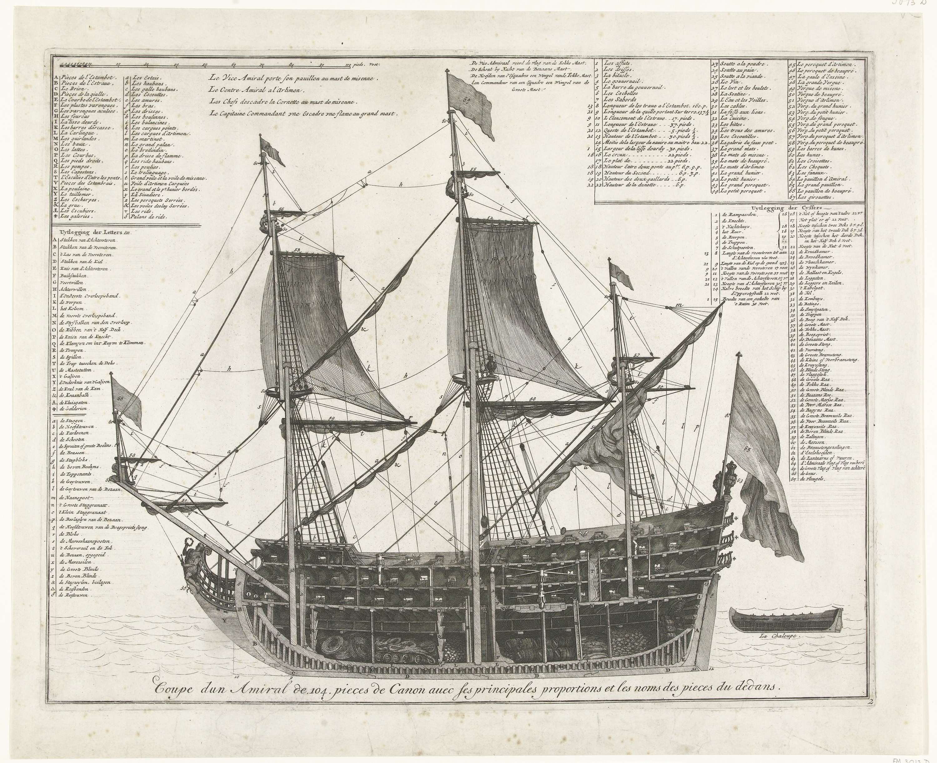 Oorlogsschip, zijaanzicht, doorsnede en details, ca....