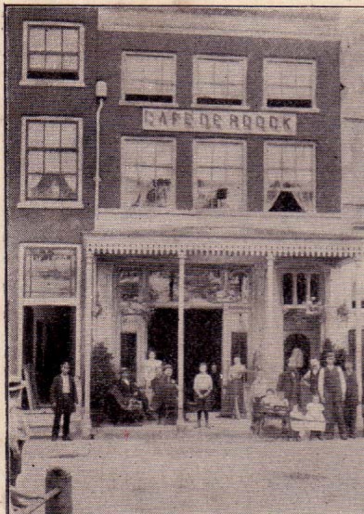 Zwart-wit foto van een groep personen voor Hotel-Caf...