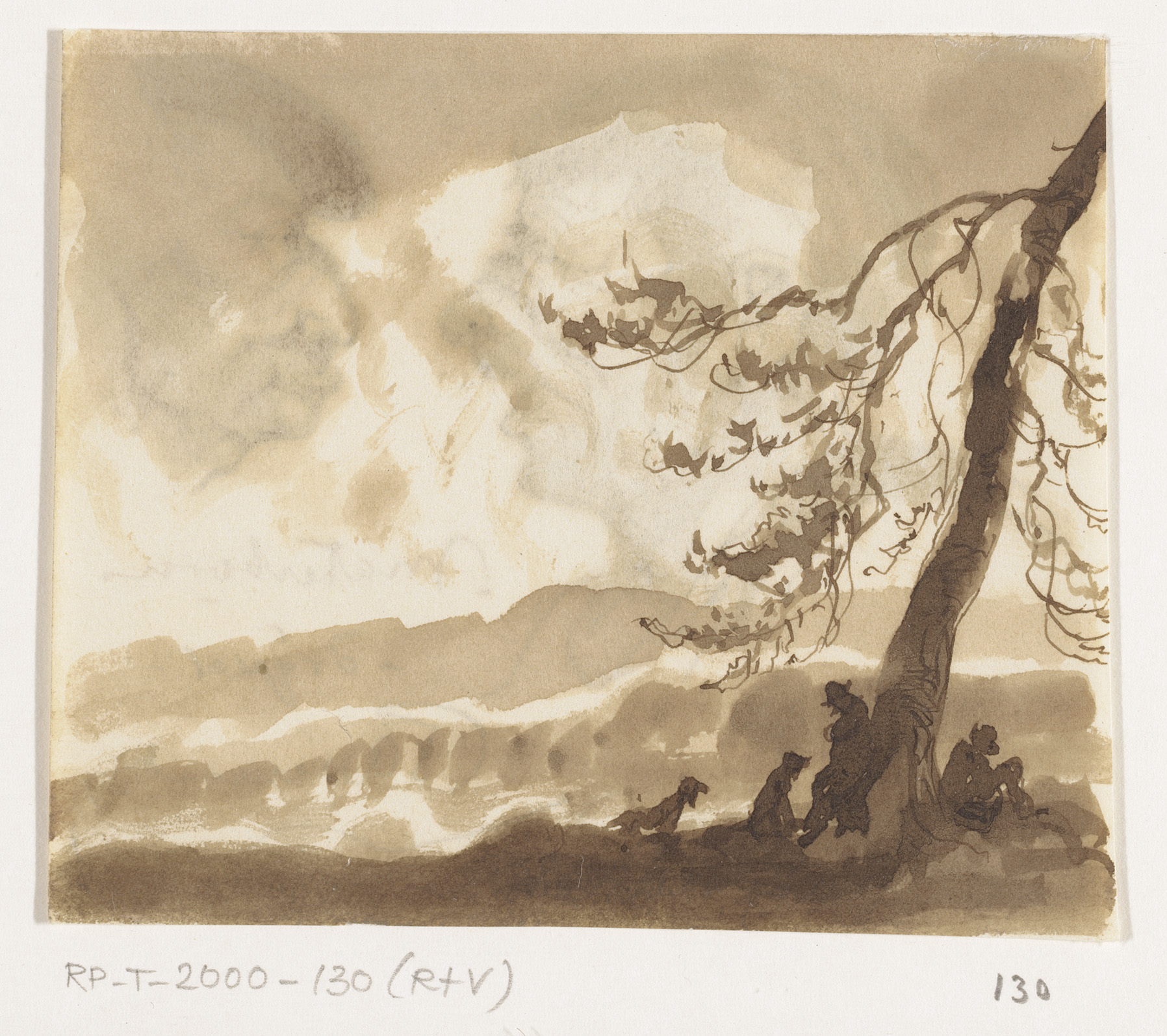 Jagers en honden onder een boom