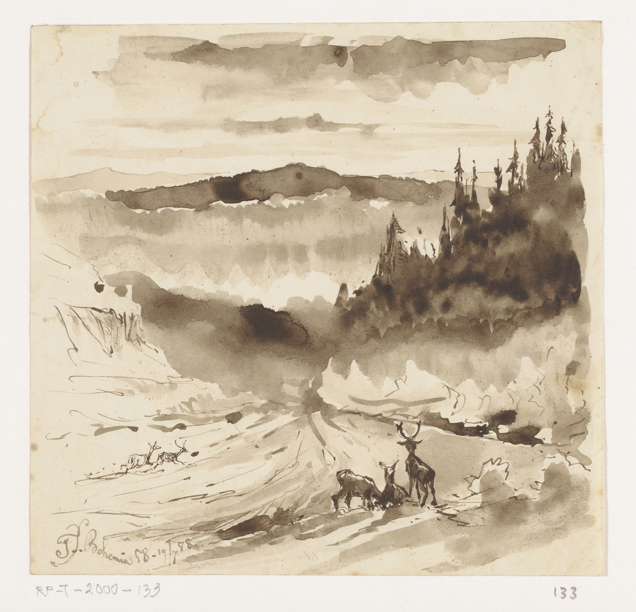 Herten voor een berglandschap in de Bohemen