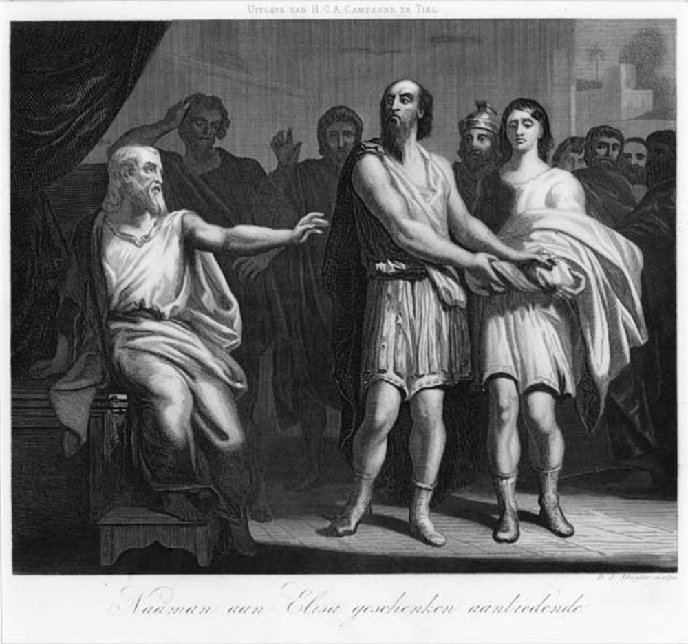 Gravure, voorstellende Naaman die geschenken aanbied...
