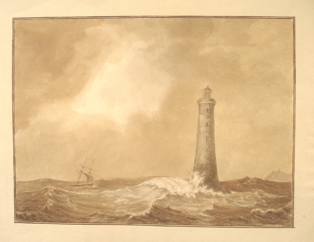 Zeegezicht met een zeilboot en vuurtoren