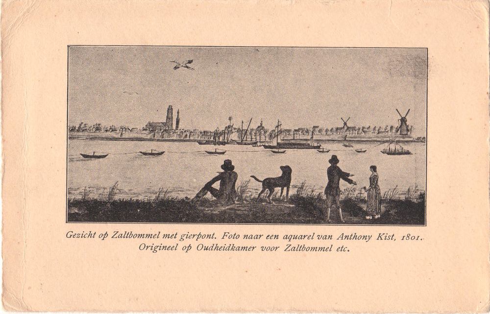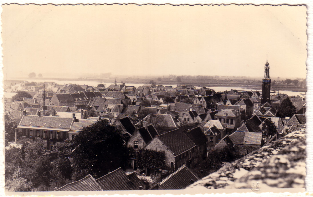 Gezicht op Zaltbommel met gierpont.
