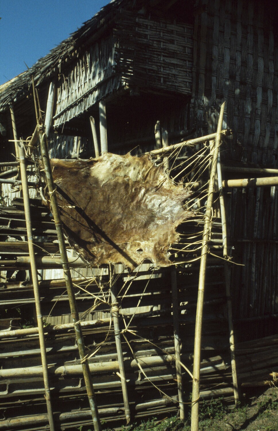 Huiden worden op een rek gespannen om te drogen. Hie...
