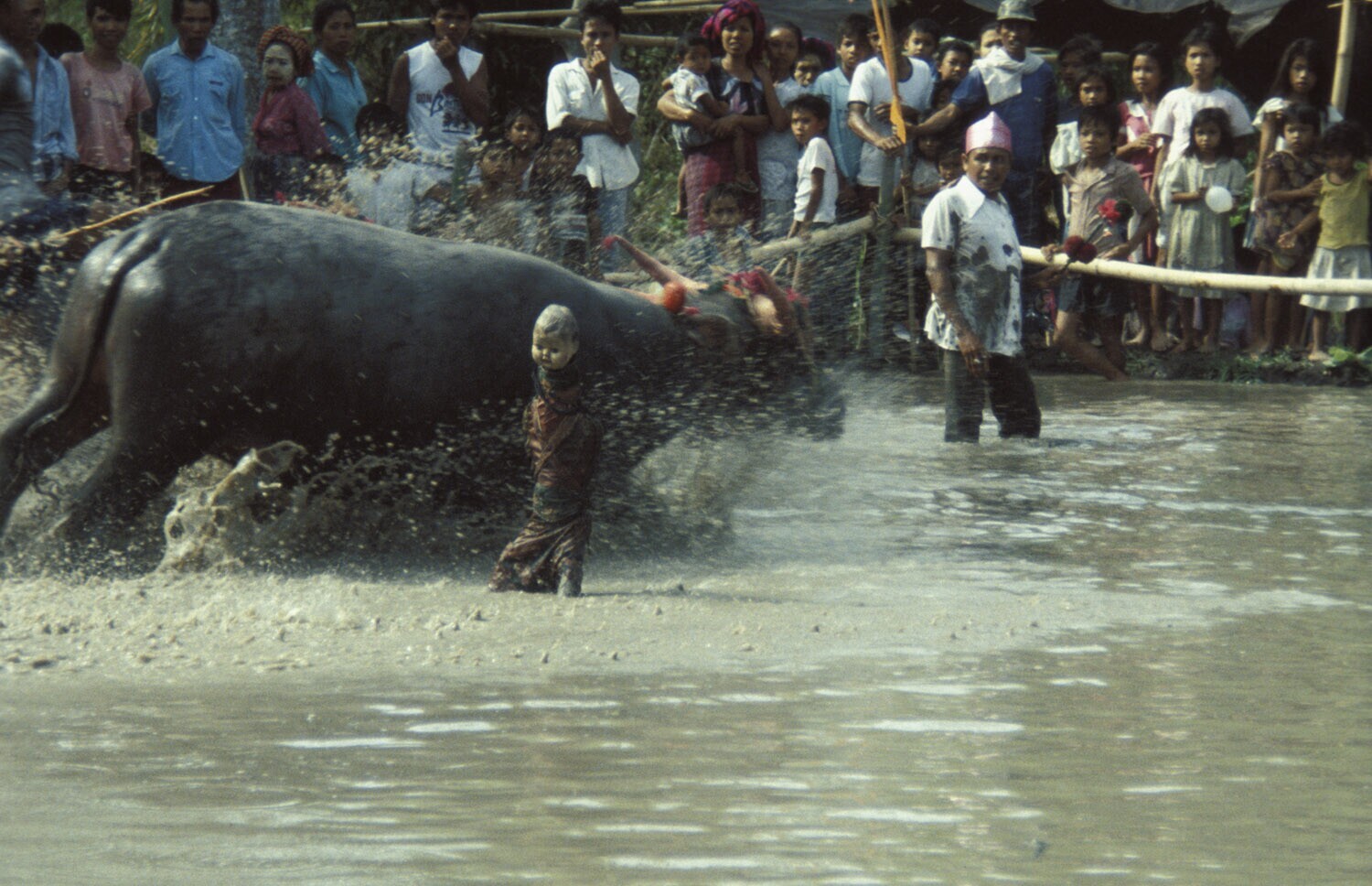 Waterbuffelrace. Het is de bedoeling dat het buffels...