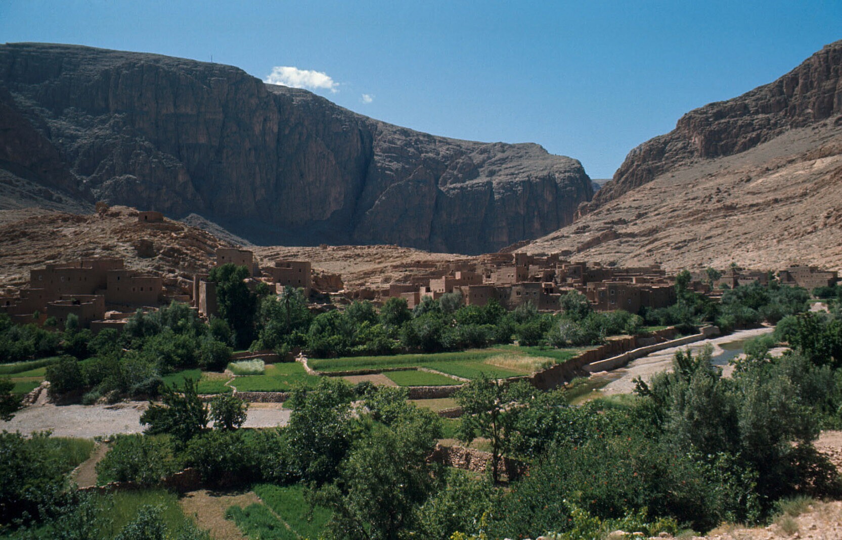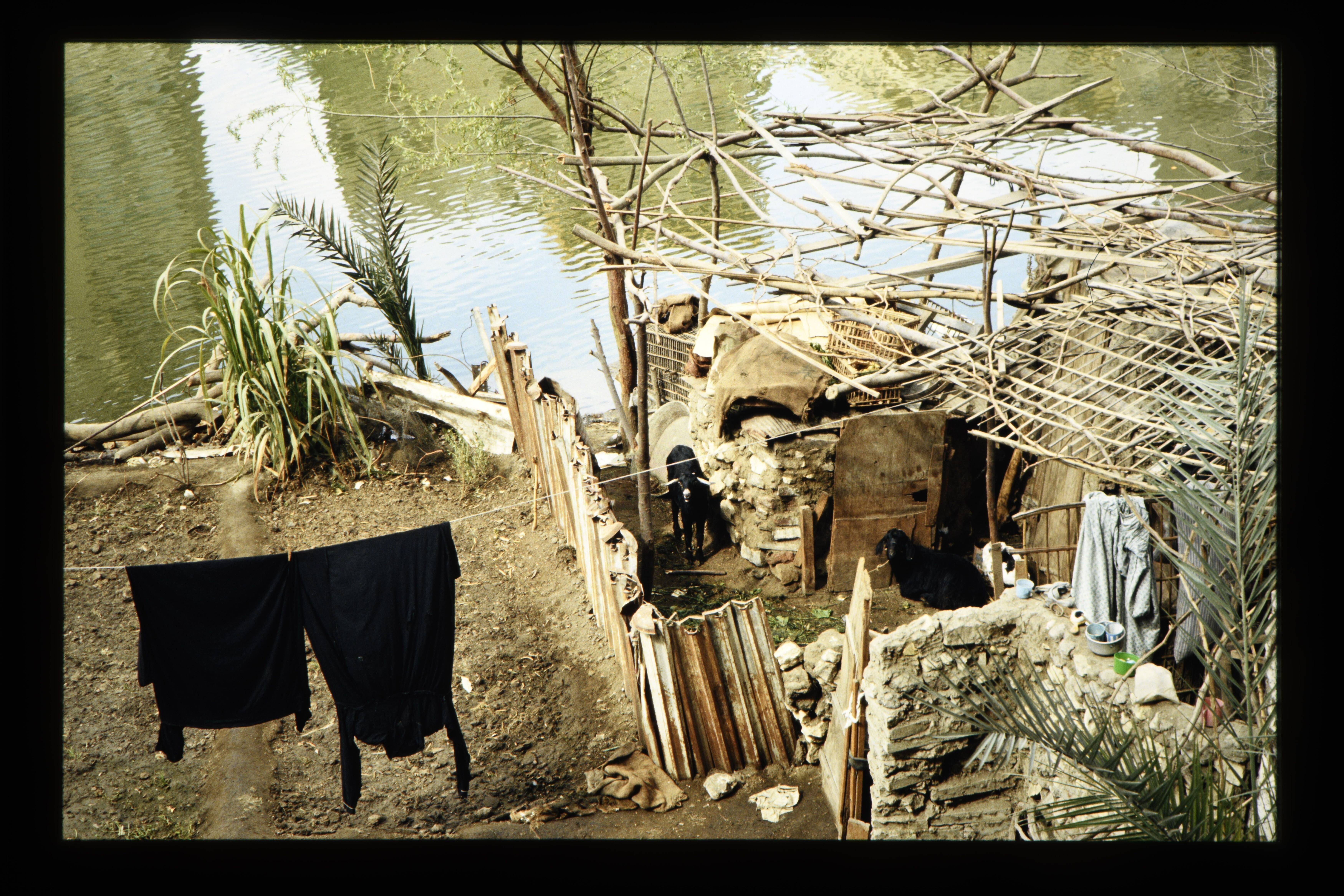 'Hutje aan de Nijl met rondlopend vee en wasgoed. '
