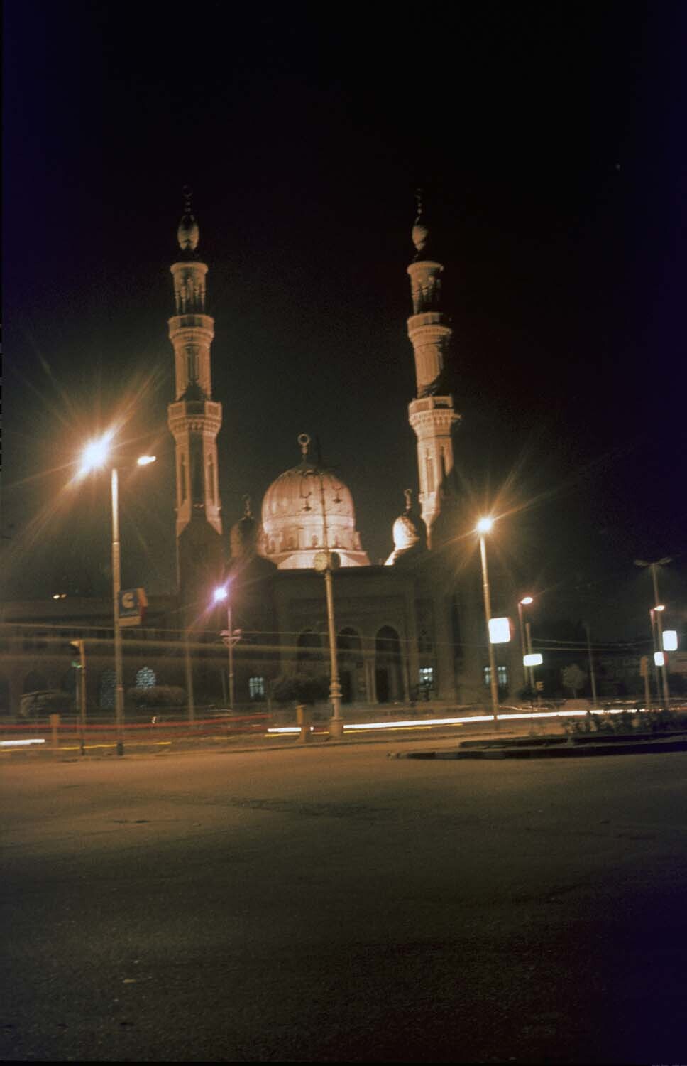 Een moskee bij nacht op het eiland Roda in de Nijl