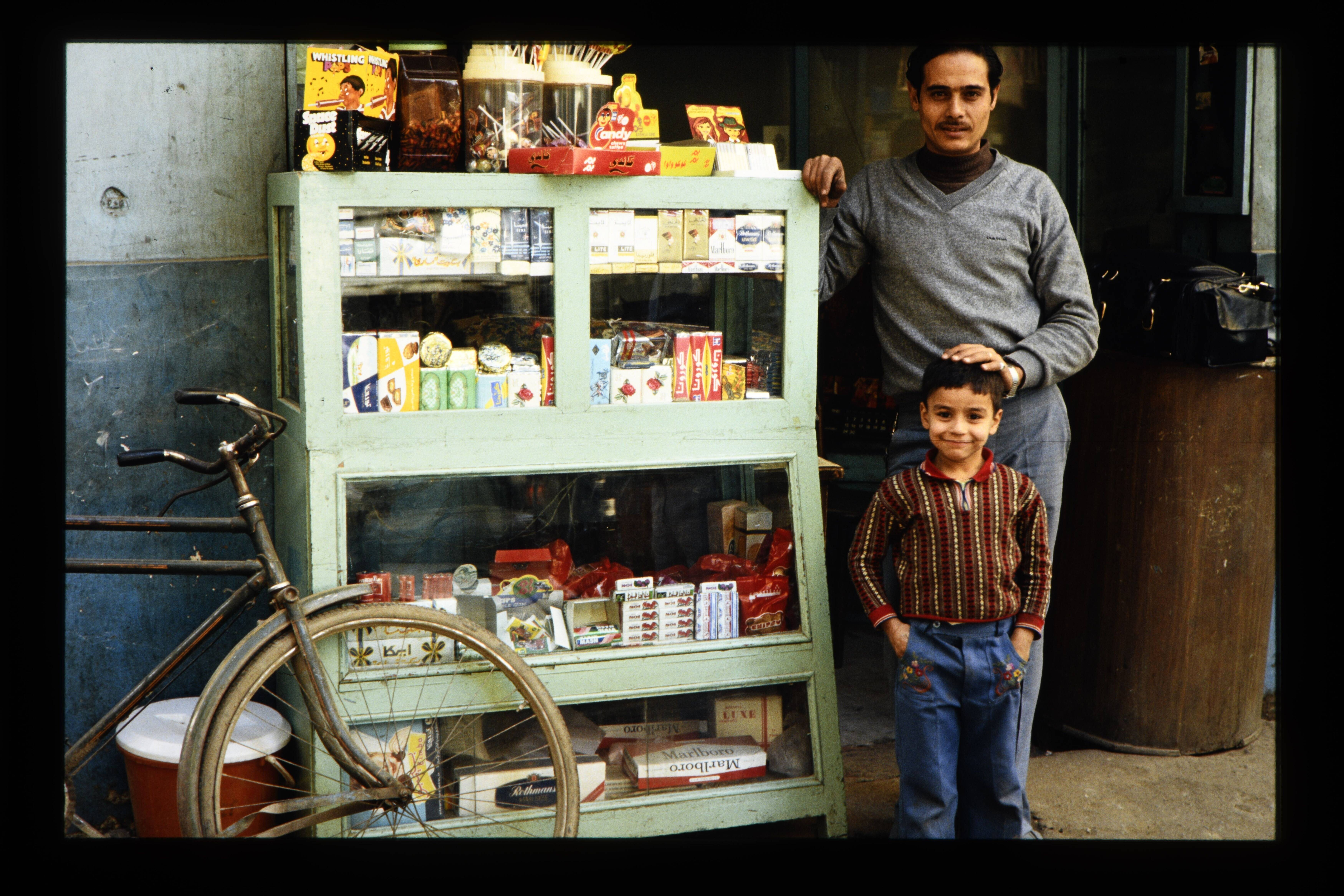 'Vader met zijn zoon bij zijn verkoopstalletje van s...