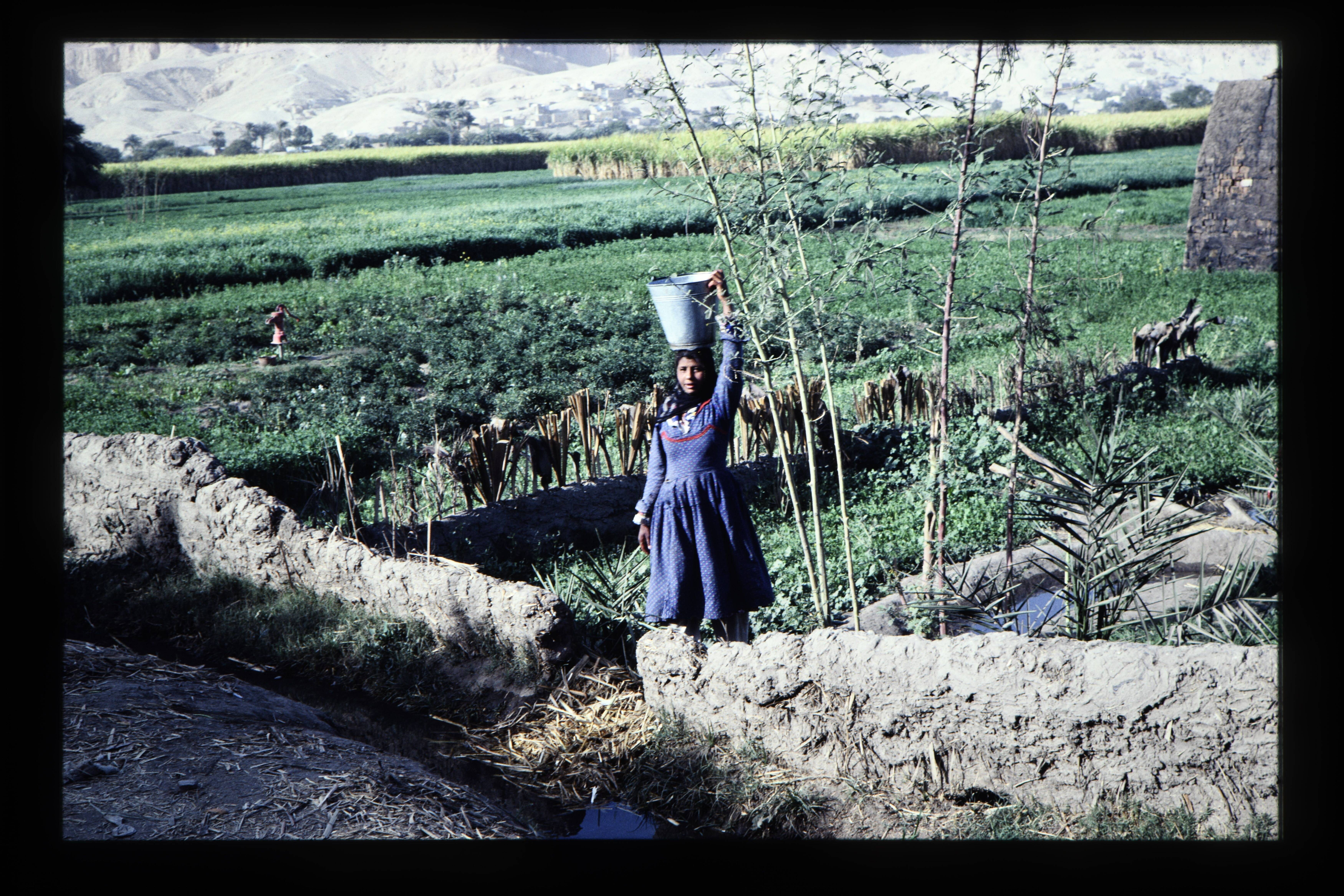 'Meisje draagt een emmer water op haar hoofd. Dorpje...