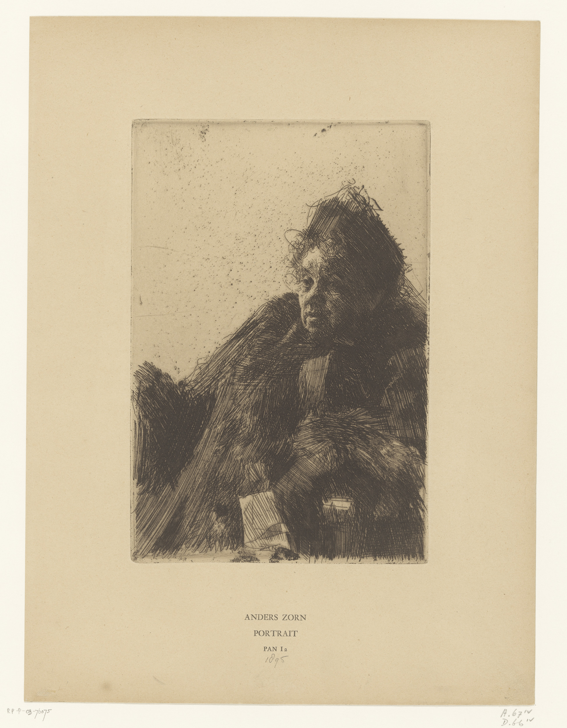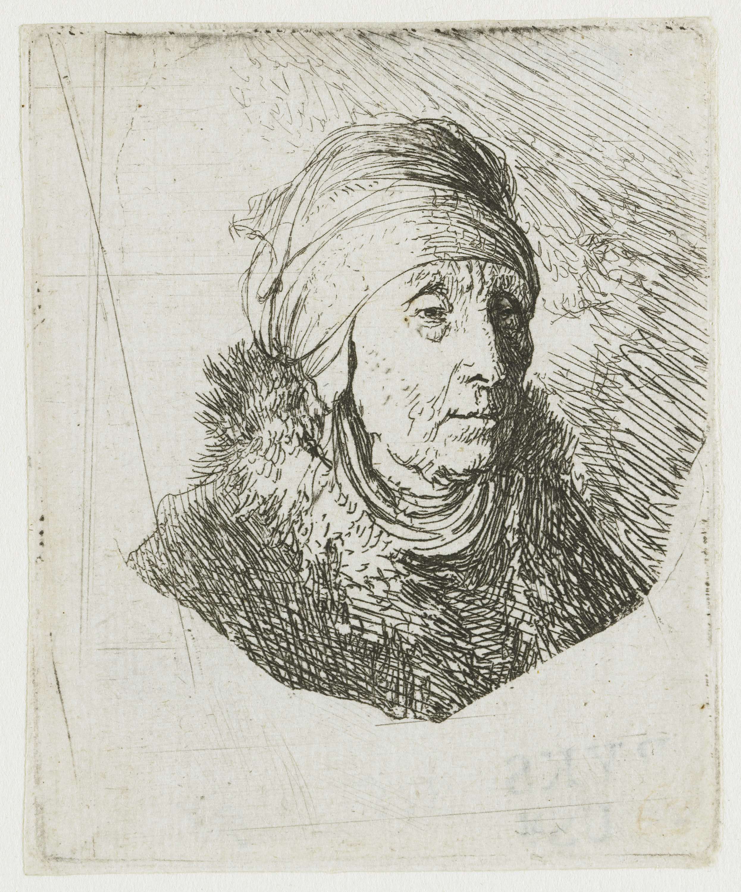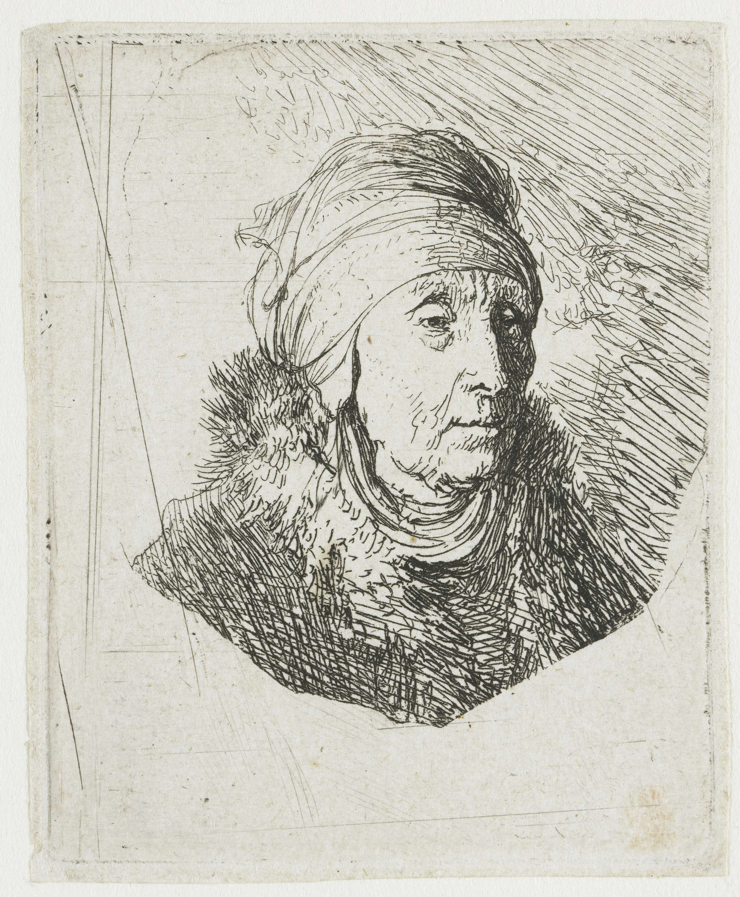 Bust of an old woman in a furred cloak and heavy hea...