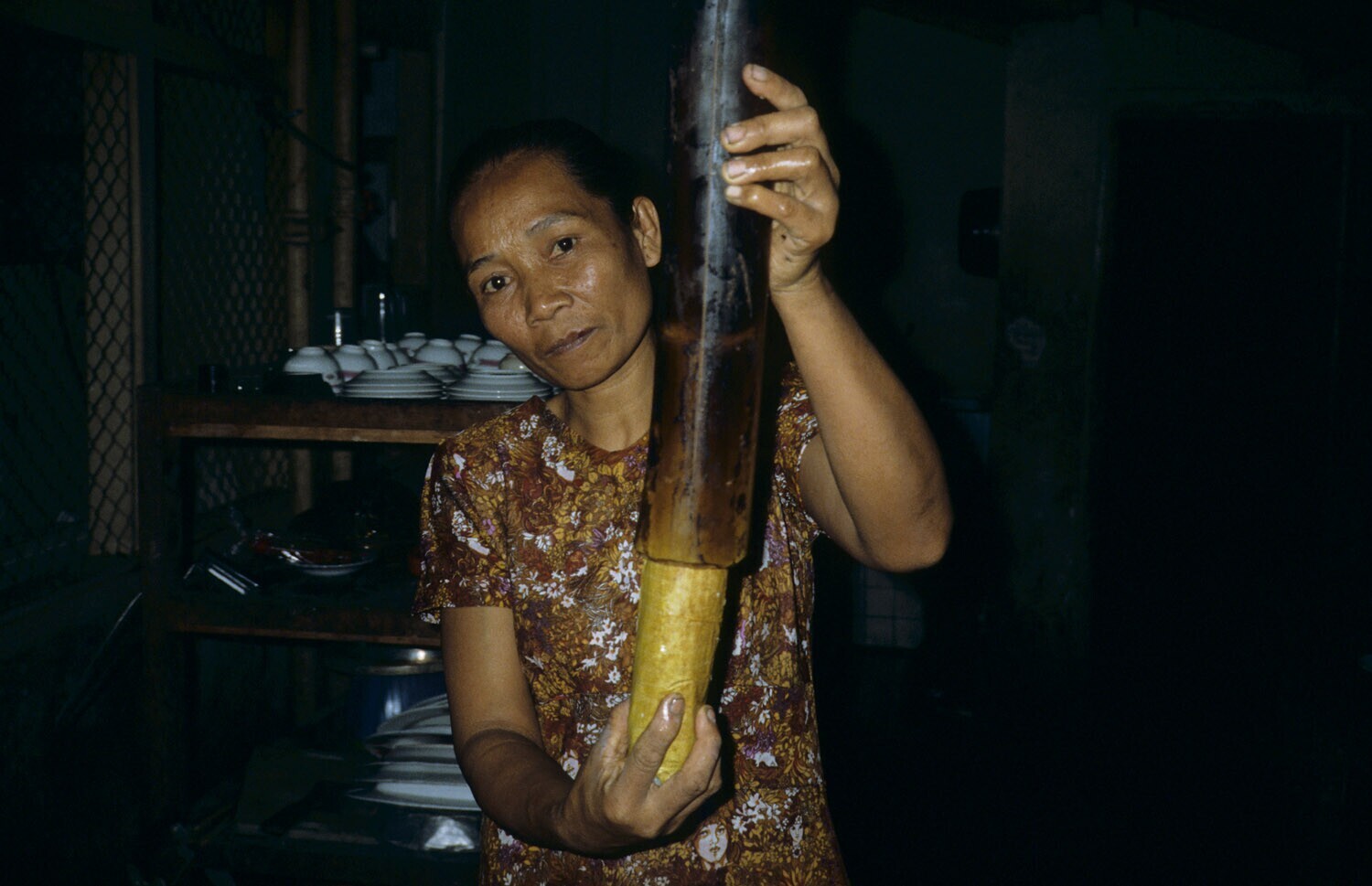 Een vrouw met Timung-rijst, gekookt in bamboe. Deze ...