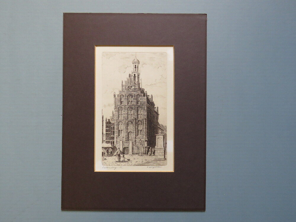 gravure voorstellende stadhuis op de Markt, gesignee...