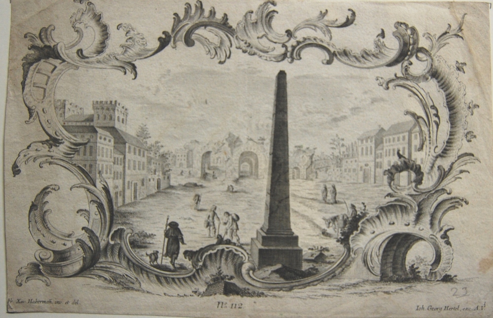 Gezicht in een stad met ruïnes en huizen. Kopergravu...