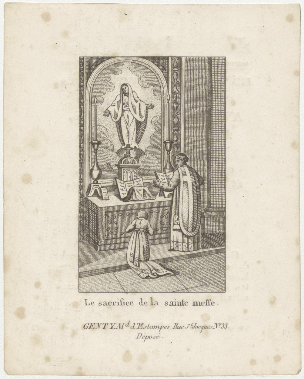 Priester voor altaar tijdens de mis (Frans), kz. Bid...