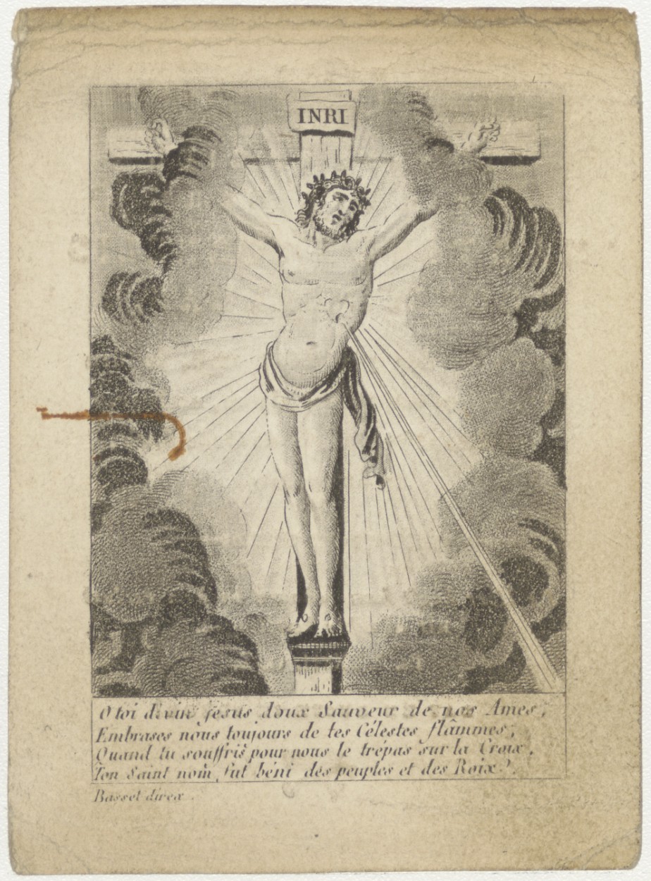 Gekruisigde Christus (Frans), kz. Bid voor ziel Bouw...