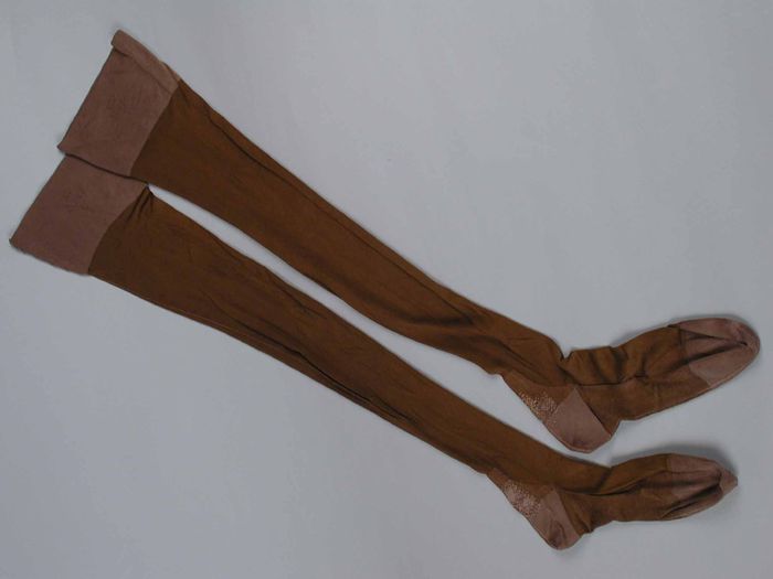 Paar lange kousen van donkerbruine tricot zijde, "El...