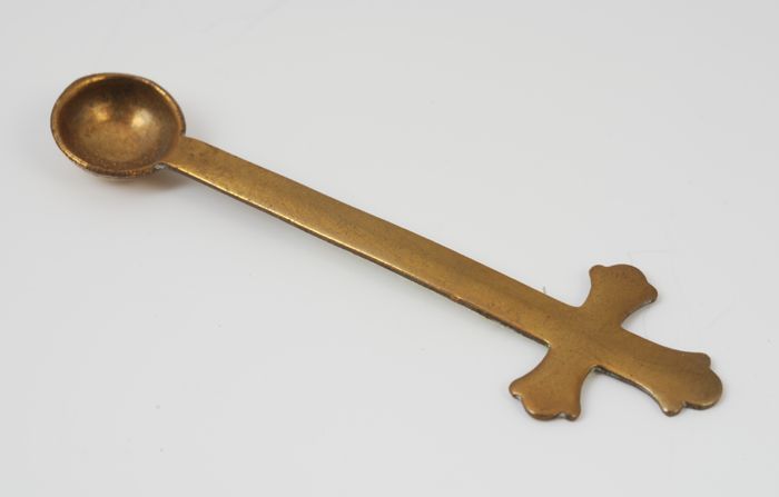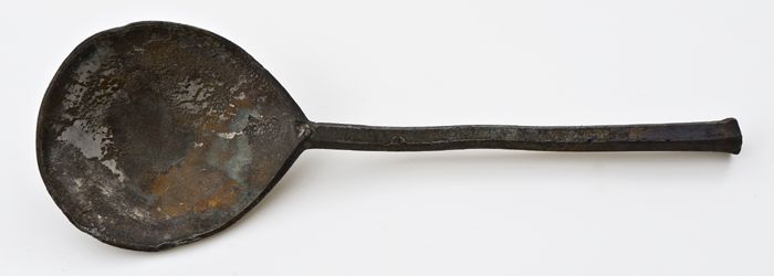 Tinnen lepel met zeshoekige steel, gemerkt