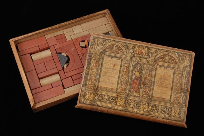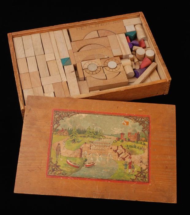 Houten kist met blokkendoos, op deksel landschap met...