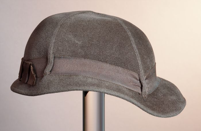 Rond dameshoedje van bruin vilt met bruin ripslint l...