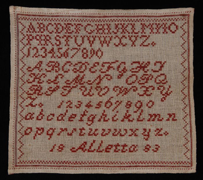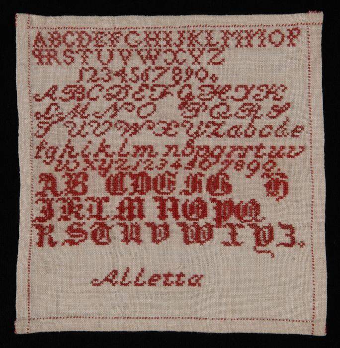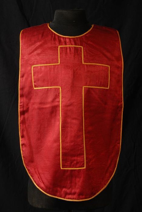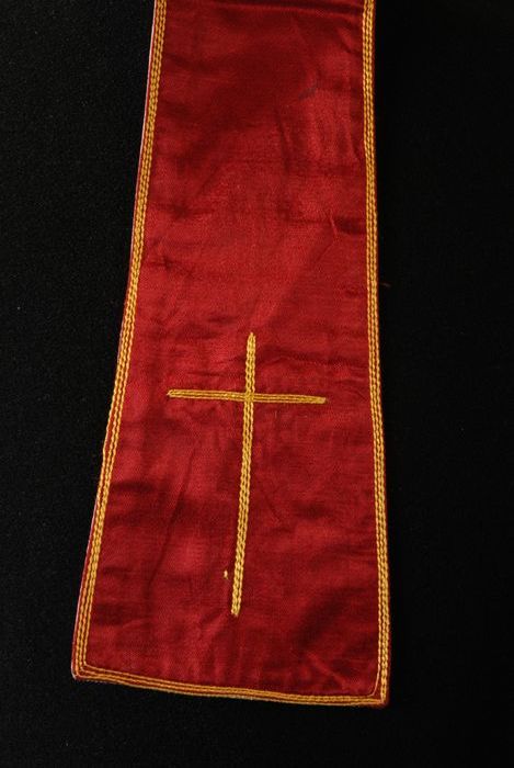 Kinderstola van bordeauxrode stof met gele sierstiks...