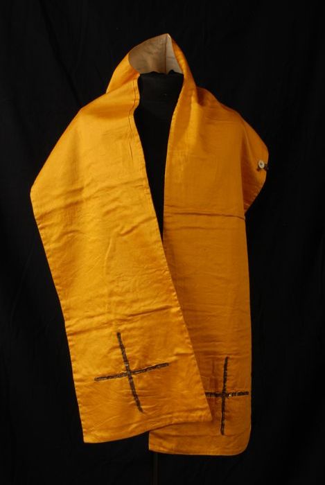 Kinderstola, lange brede gevoerde lap van donkergele...