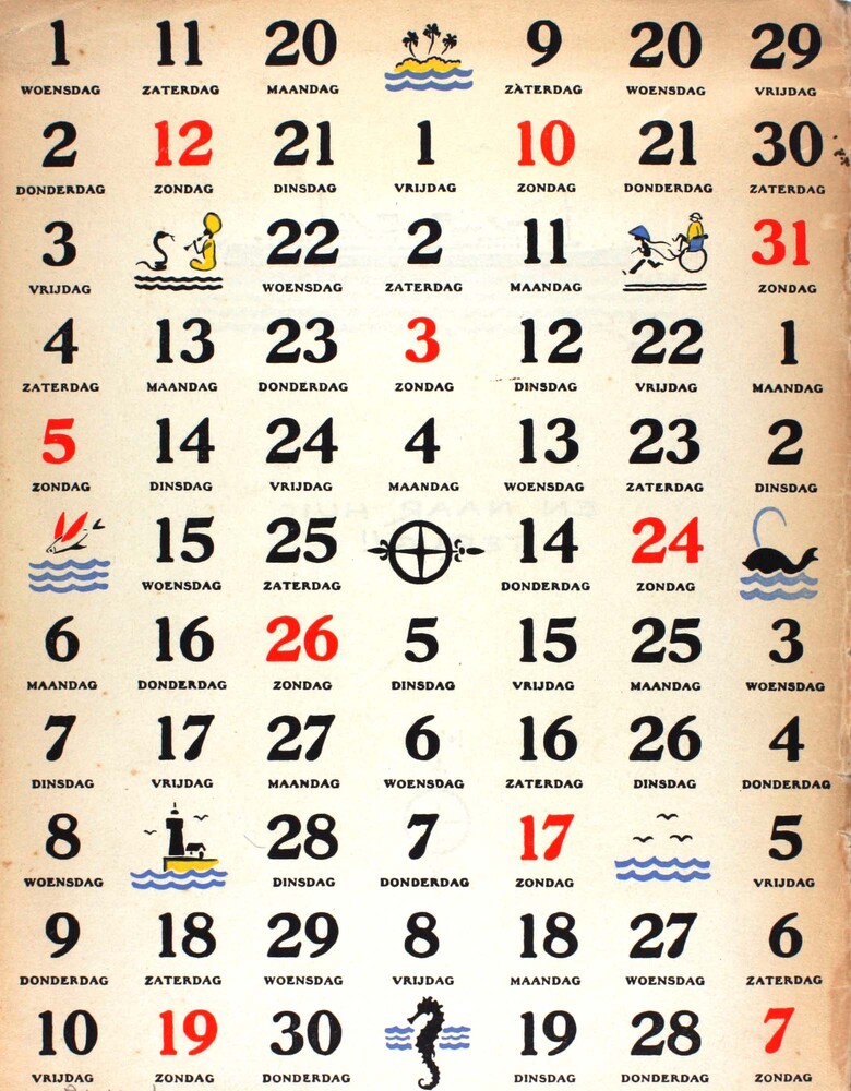 Illustratie door Jo Spier van kalenderdata met klein...