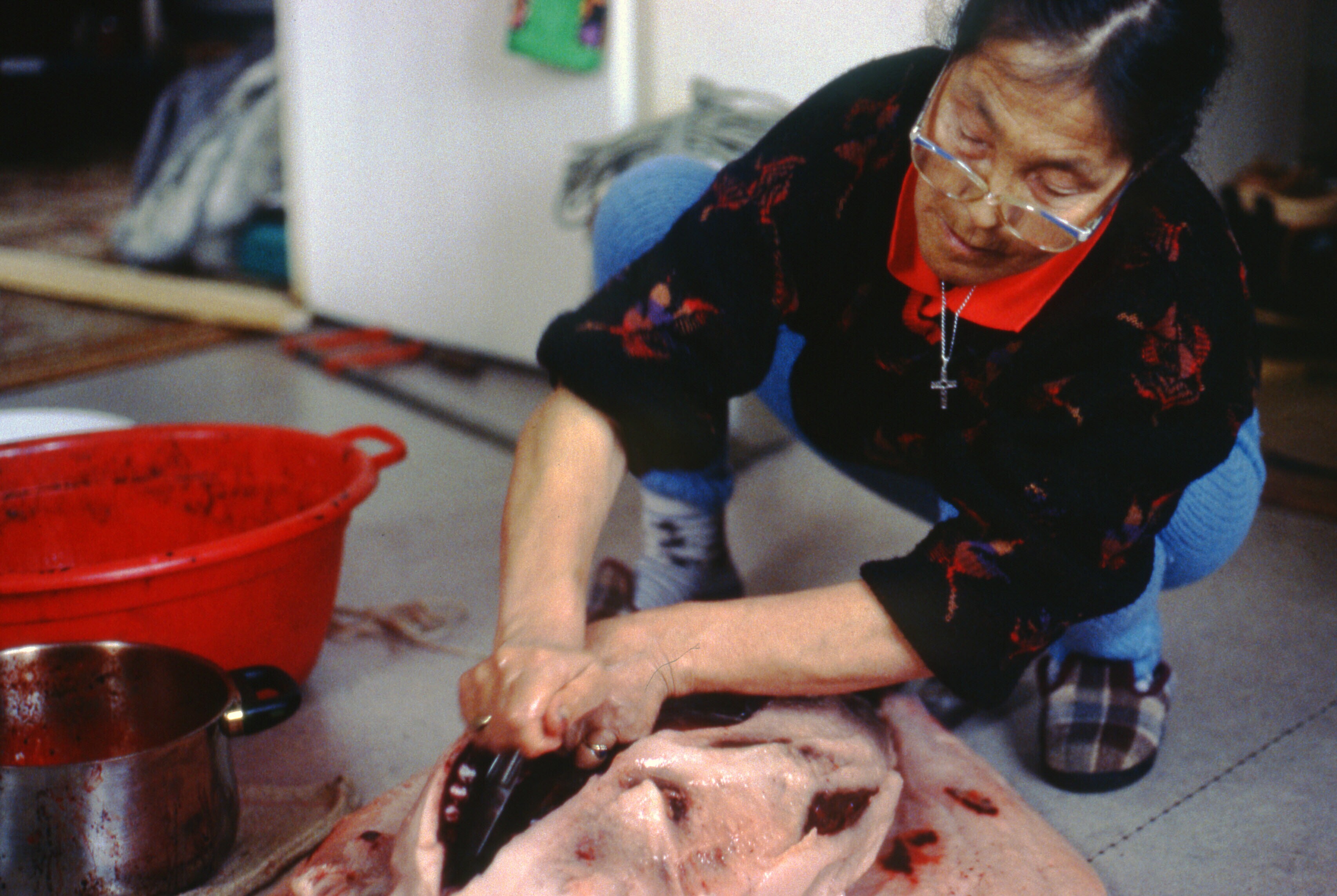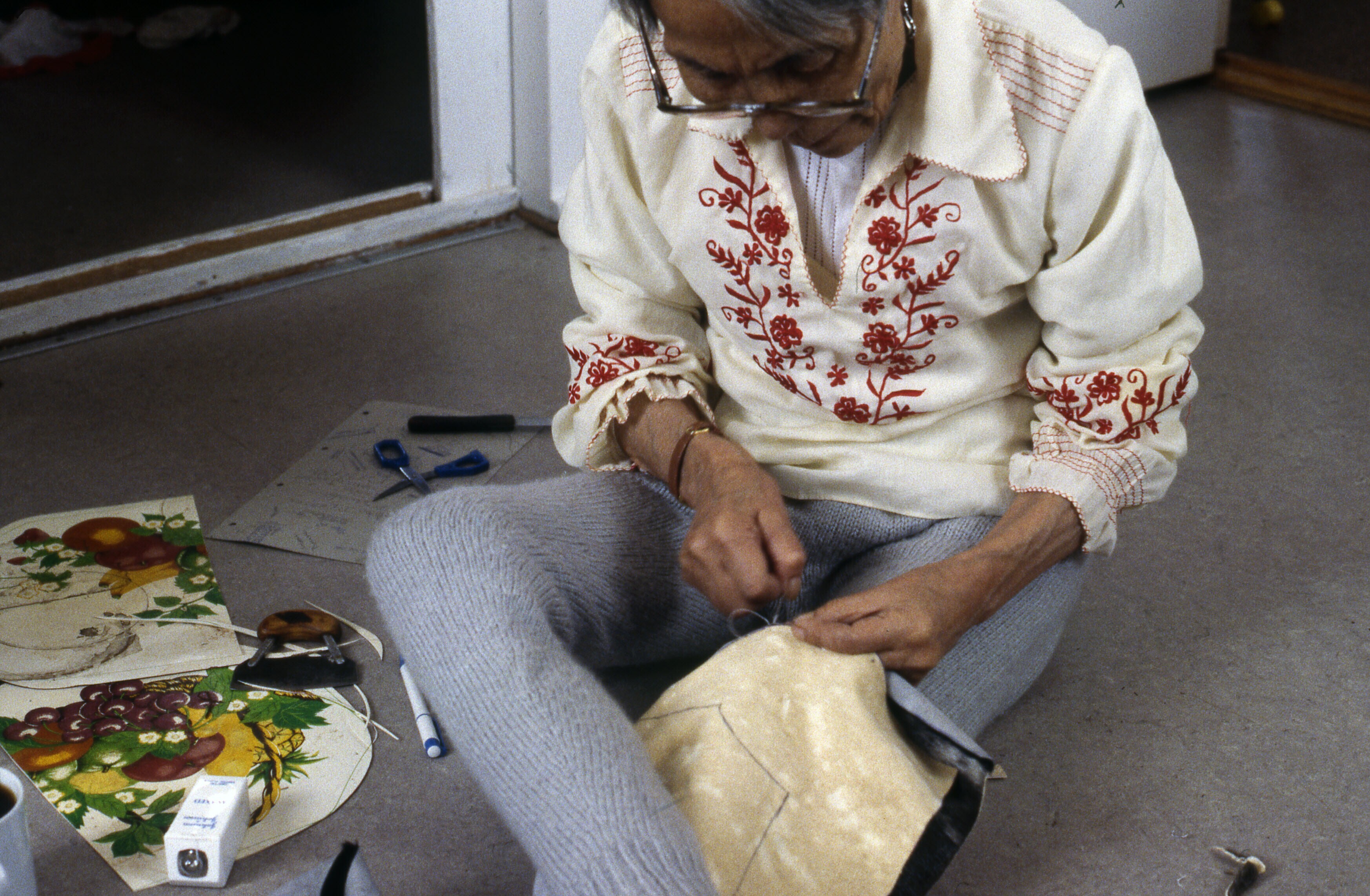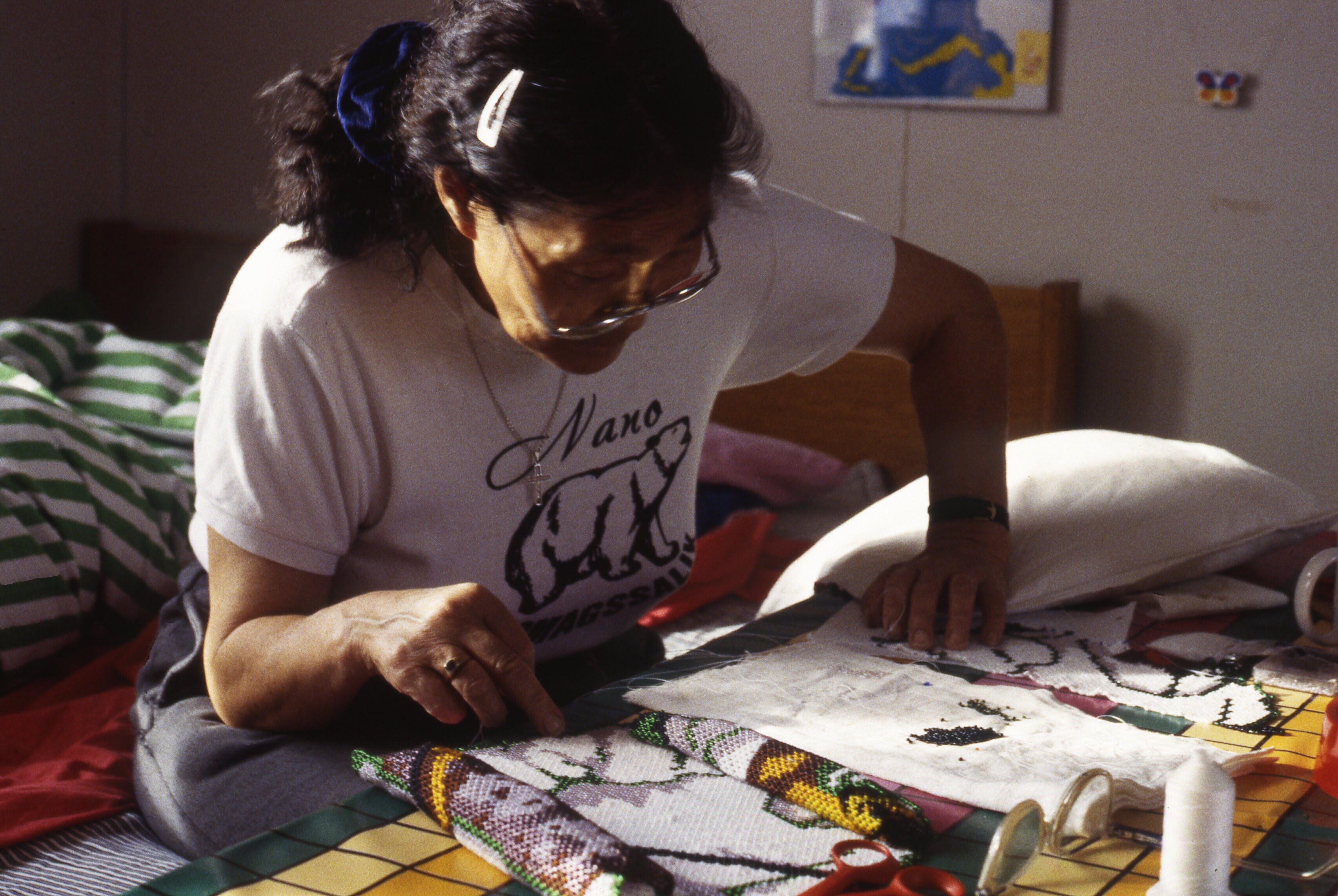 - Asta Jonathansen bewerkt een hondenhuid. Tiniteqil...