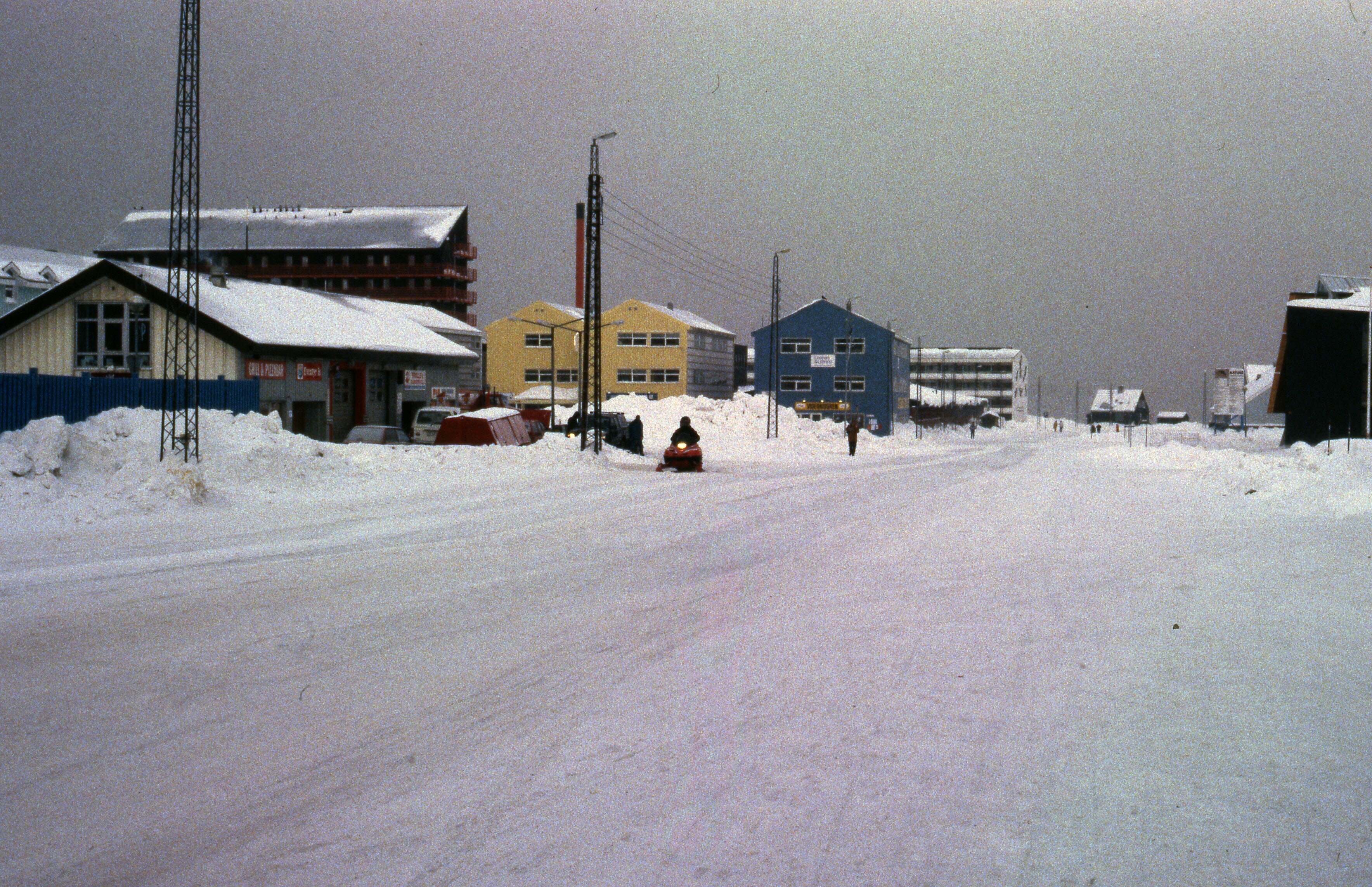 - Besneeuwd straatbeeld van Nuuk, huizen en een snee...