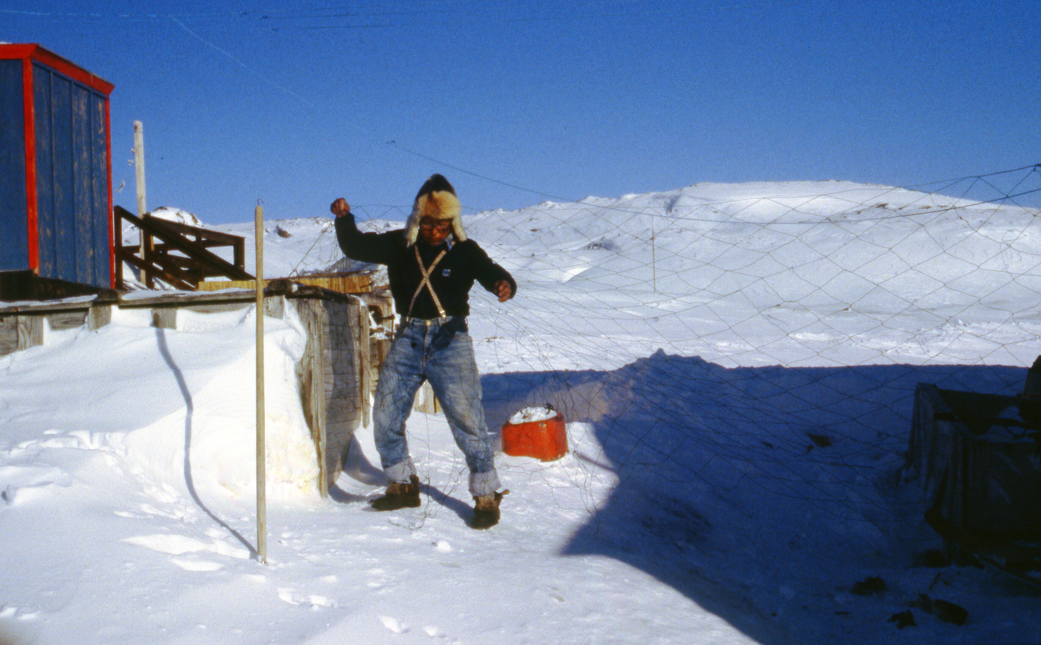 - Lars Jonathansen is bezig een zeehondehuid te drog...