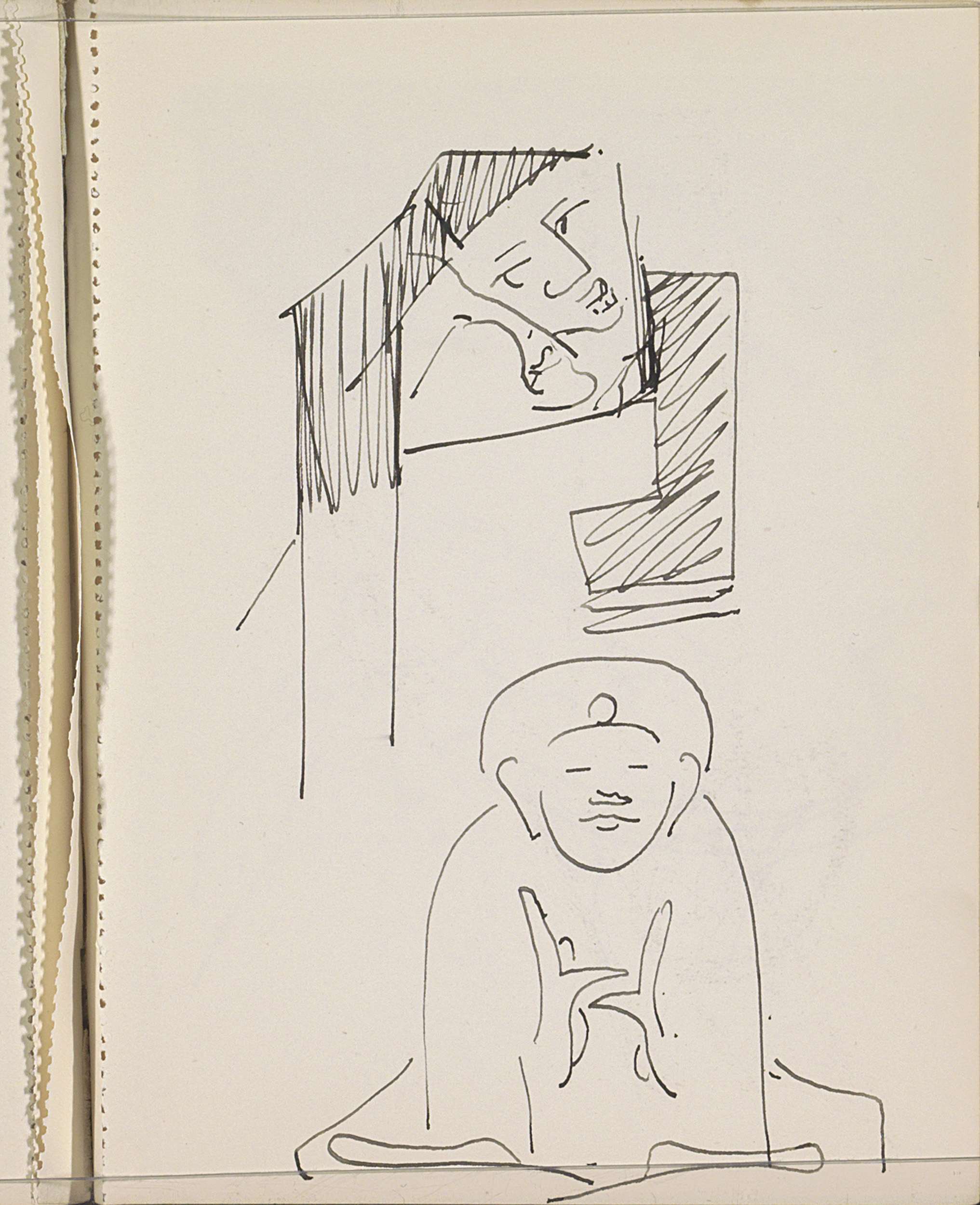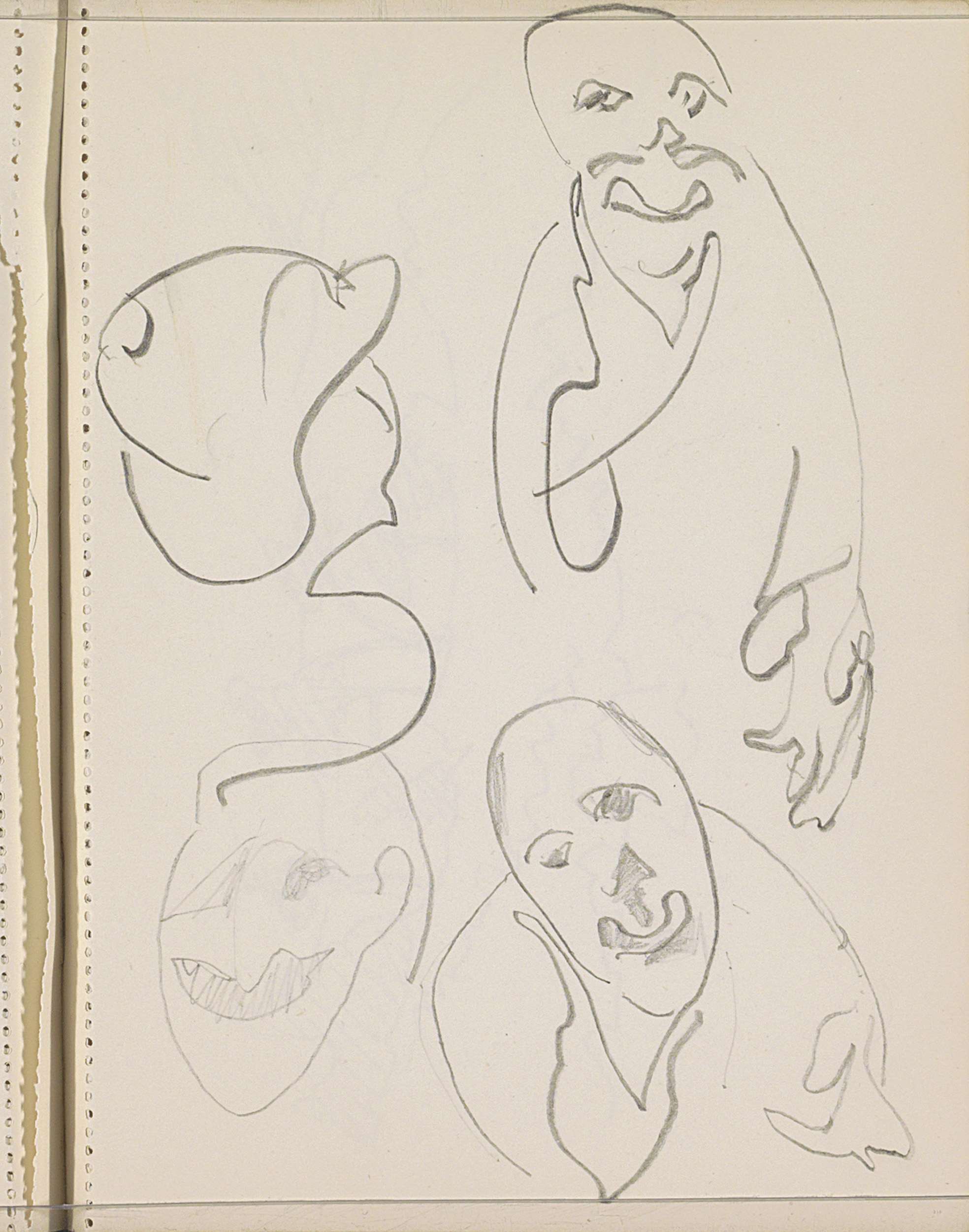 Twee geabstraheerde gezichten en een man in kleermak...