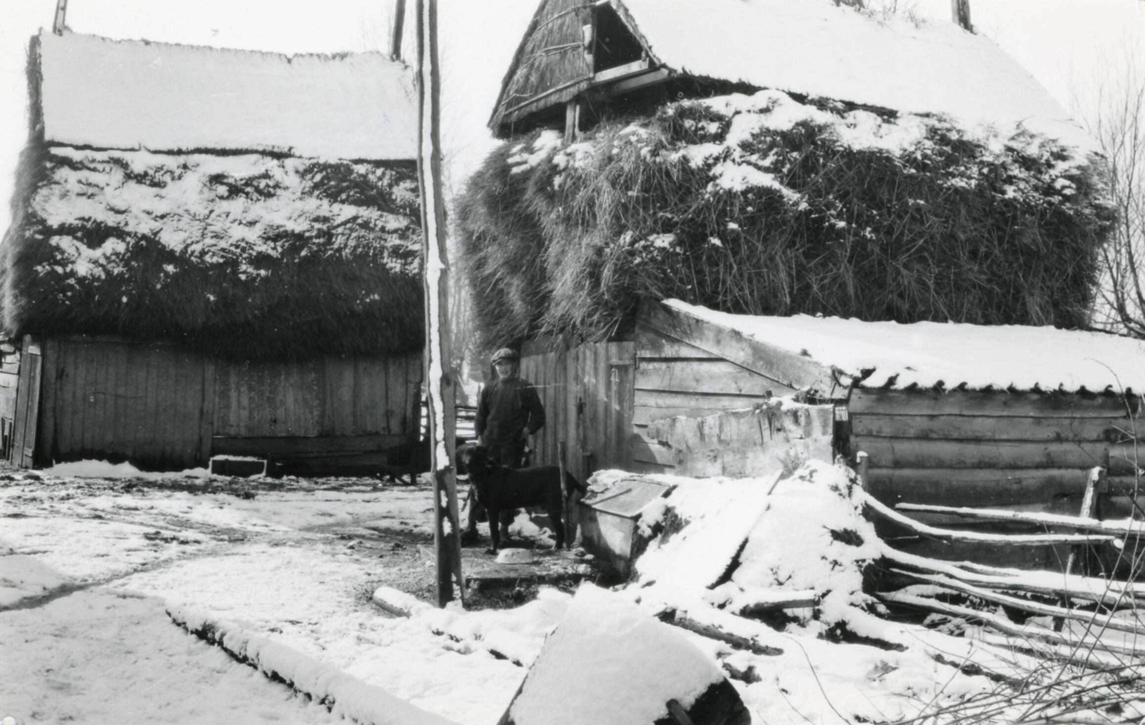 Boerenerf in de sneeuw, Bennekom, 1934 (zwart-wit foto)
