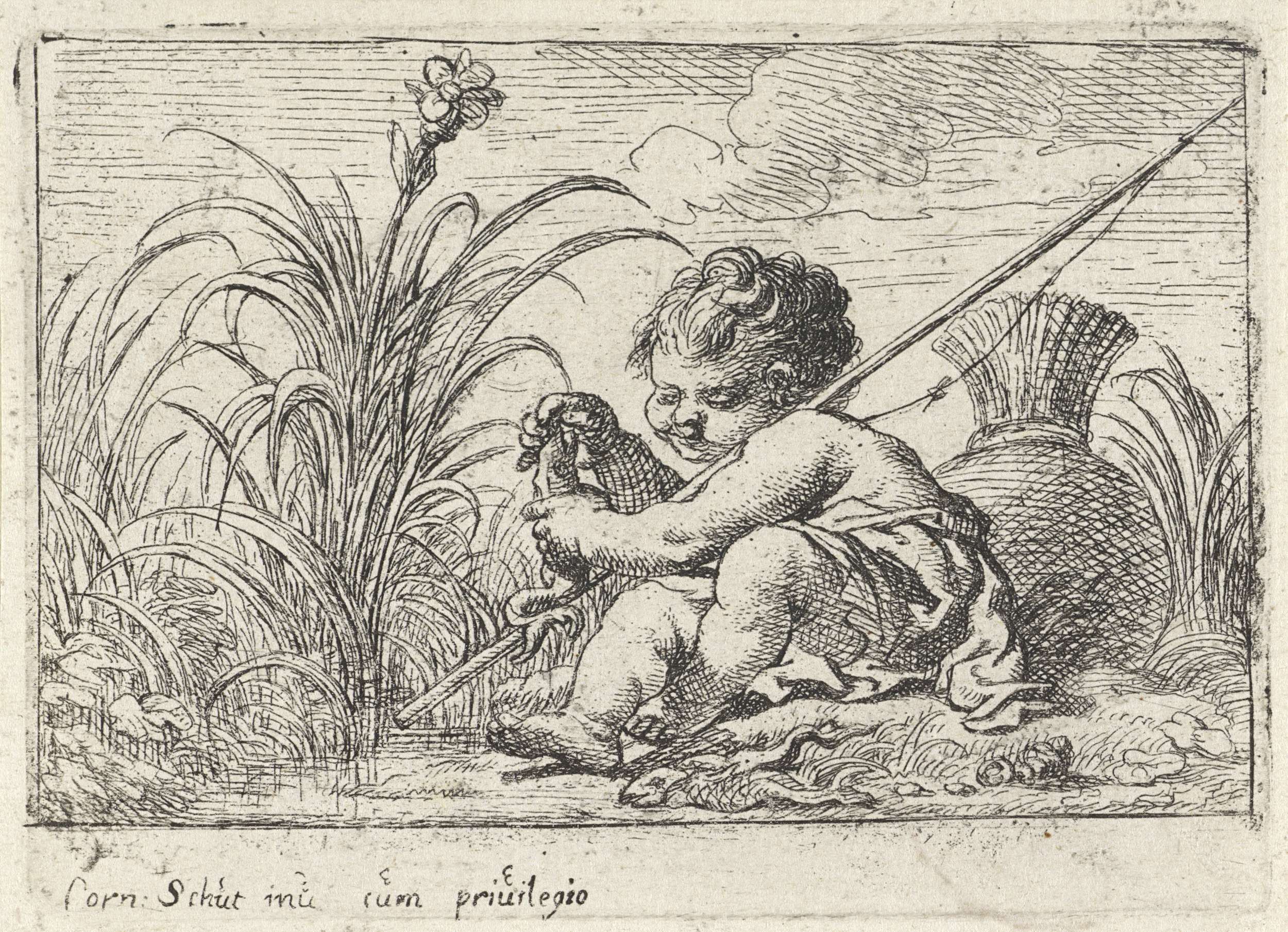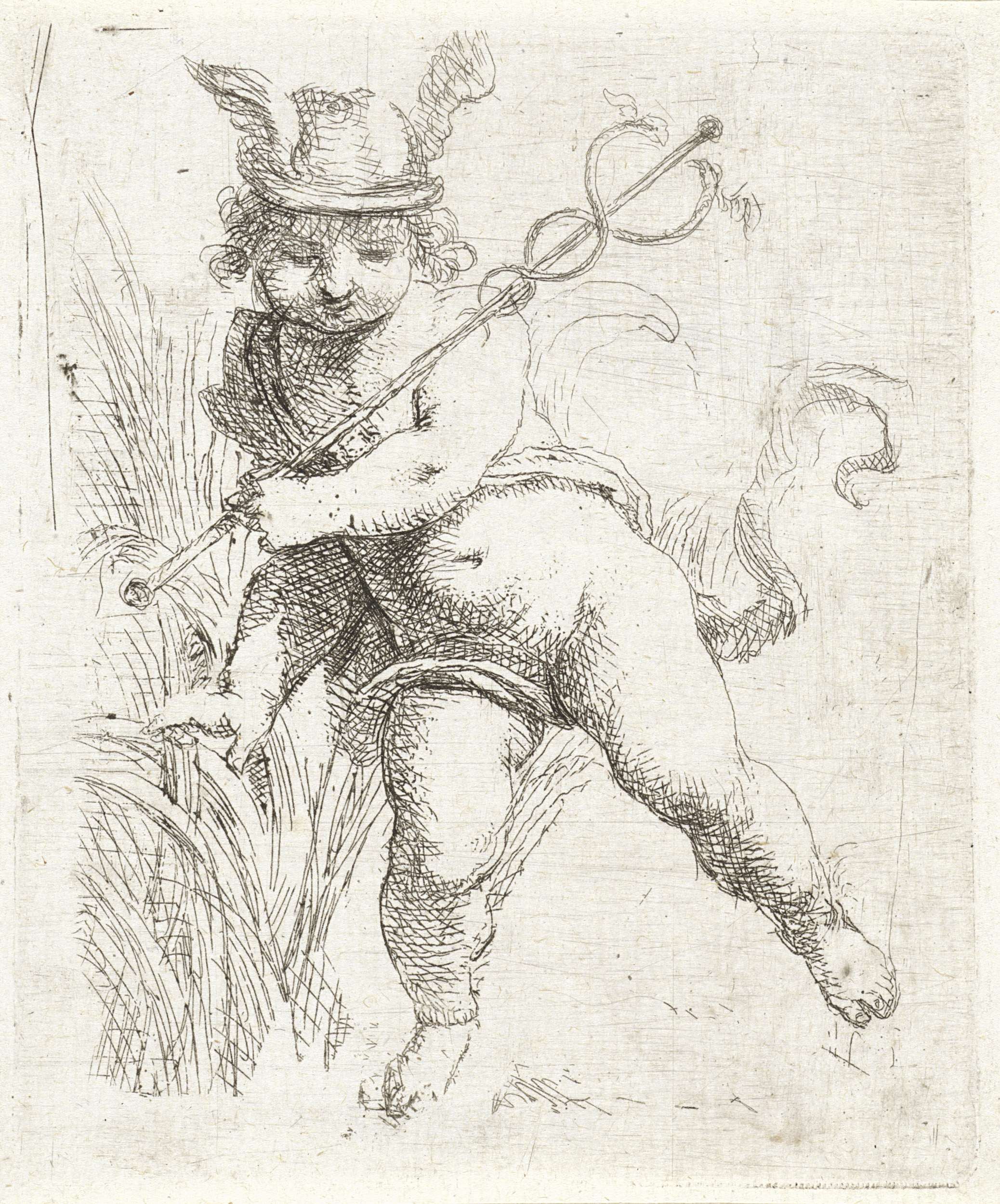 Putto als Mercurius, met gevleugelde helm en caduceus