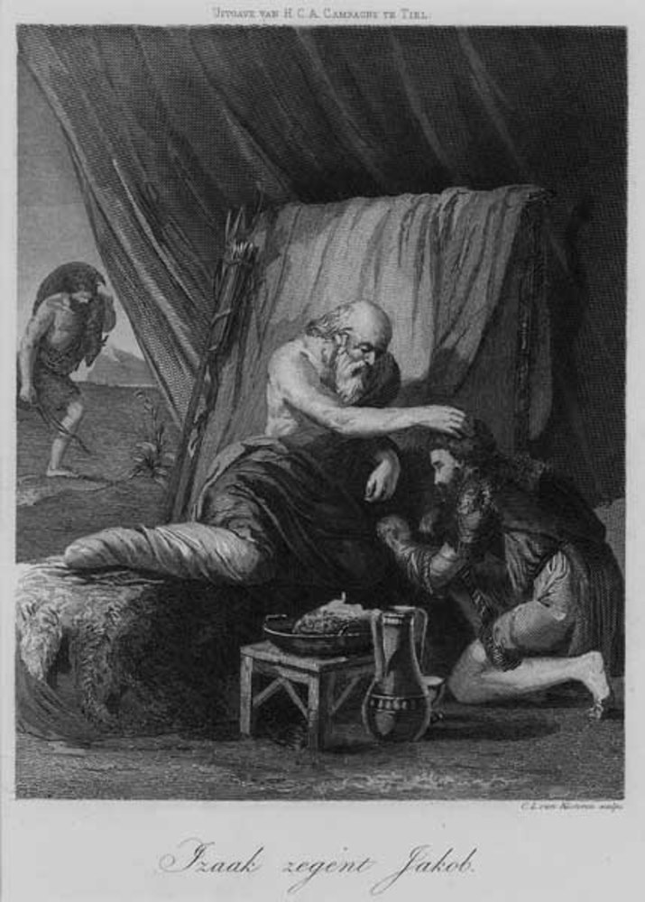 Gravure, voorstellende Izaak die Jacob zegent, verva...