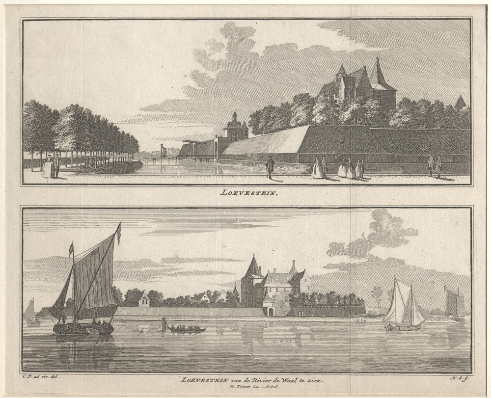 Dubbele prent over slot Loevestein gezien vanaf de r...