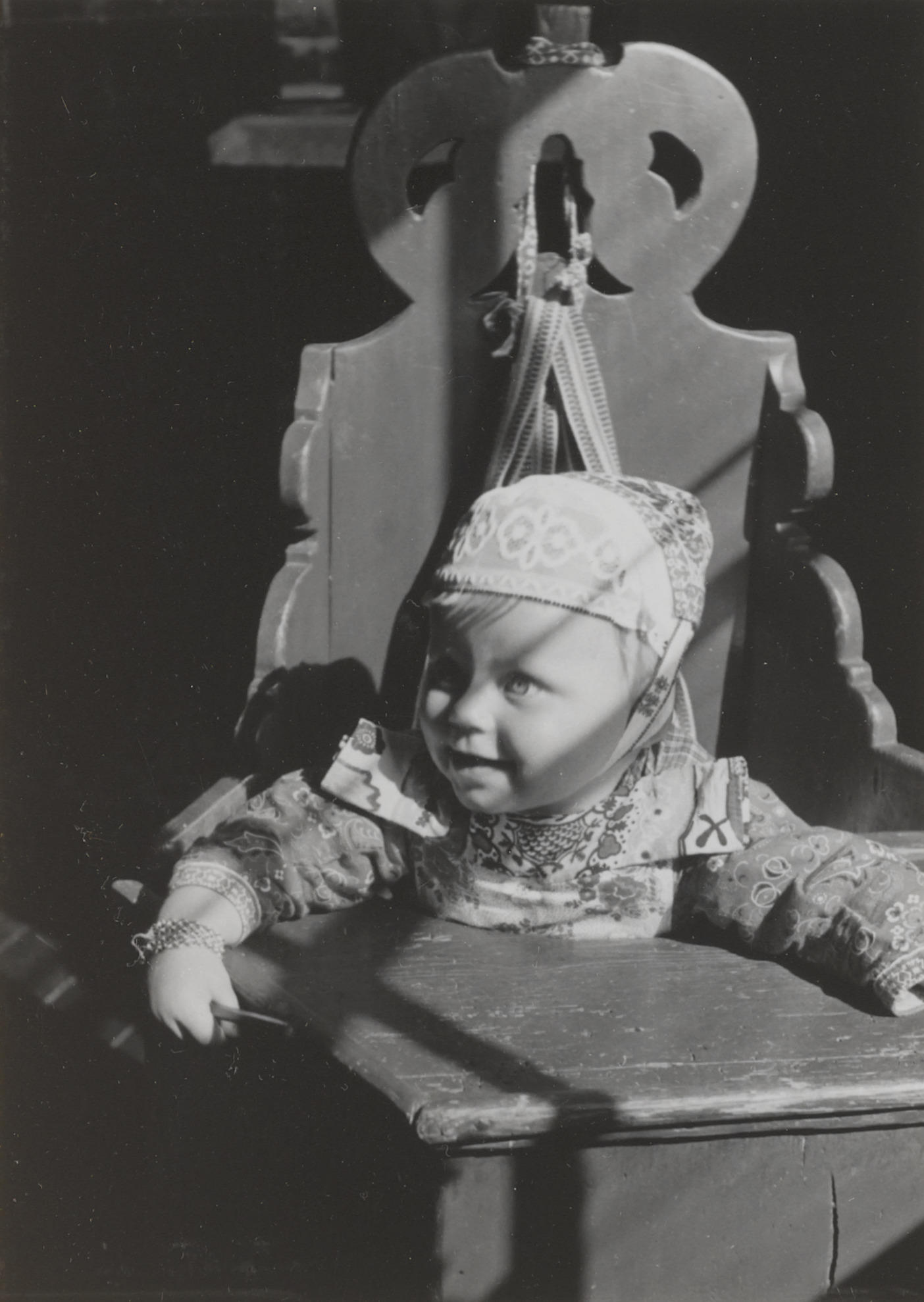 Meisje in kakstoel, Marken, 1943 (zwart-wit foto)