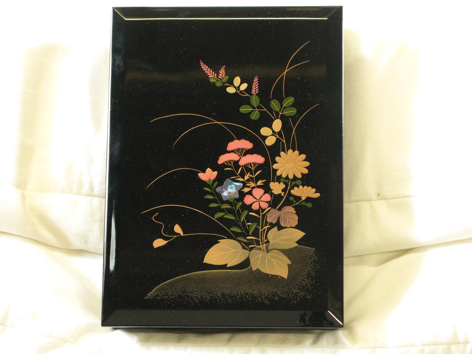Zwart lakdoosje met bloemen in kartonnen doosje