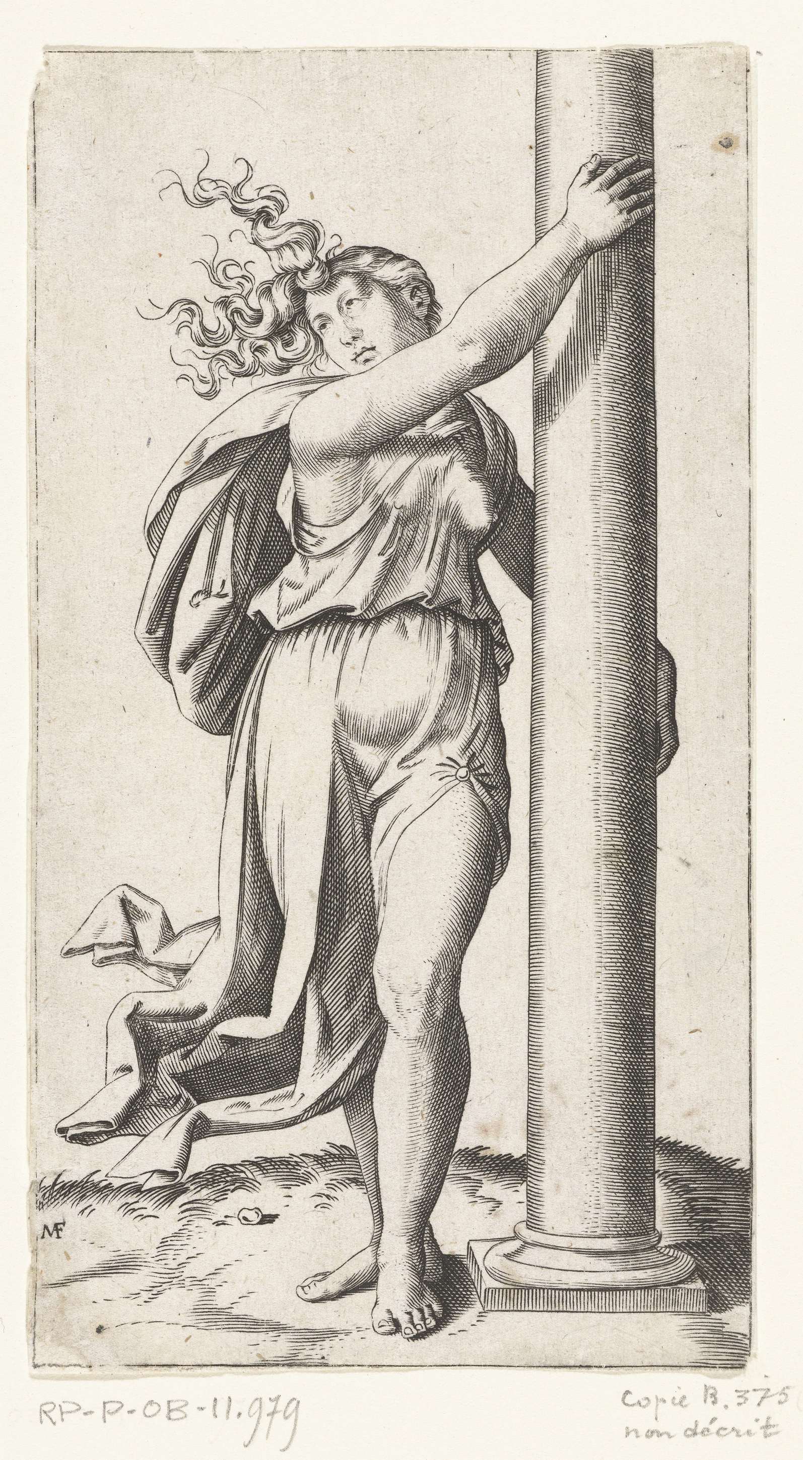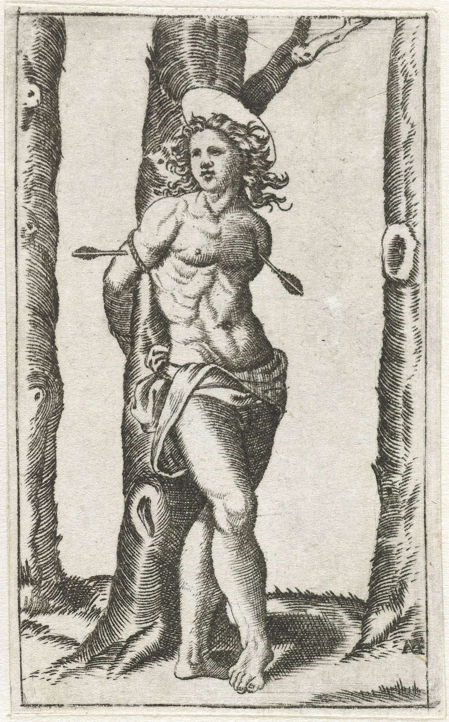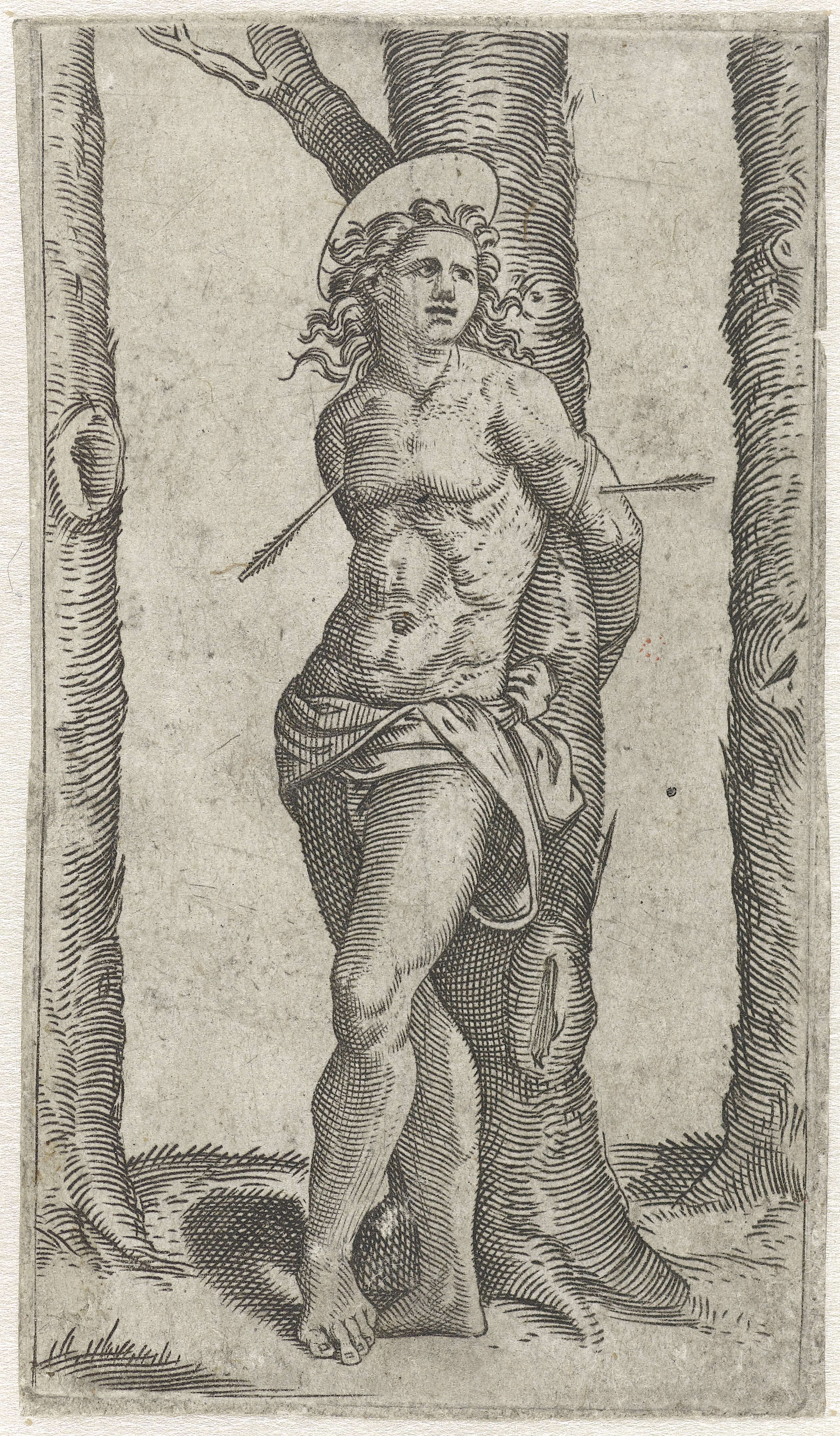 Heilige Sebastiaan vastgebonden aan boom met pijlen ...