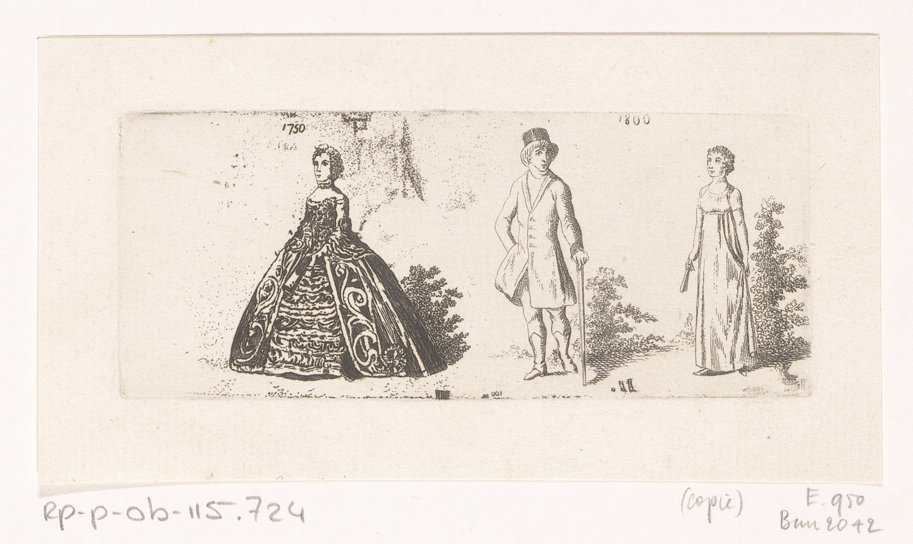 Drie figuren in mode uit 1750 en 1800