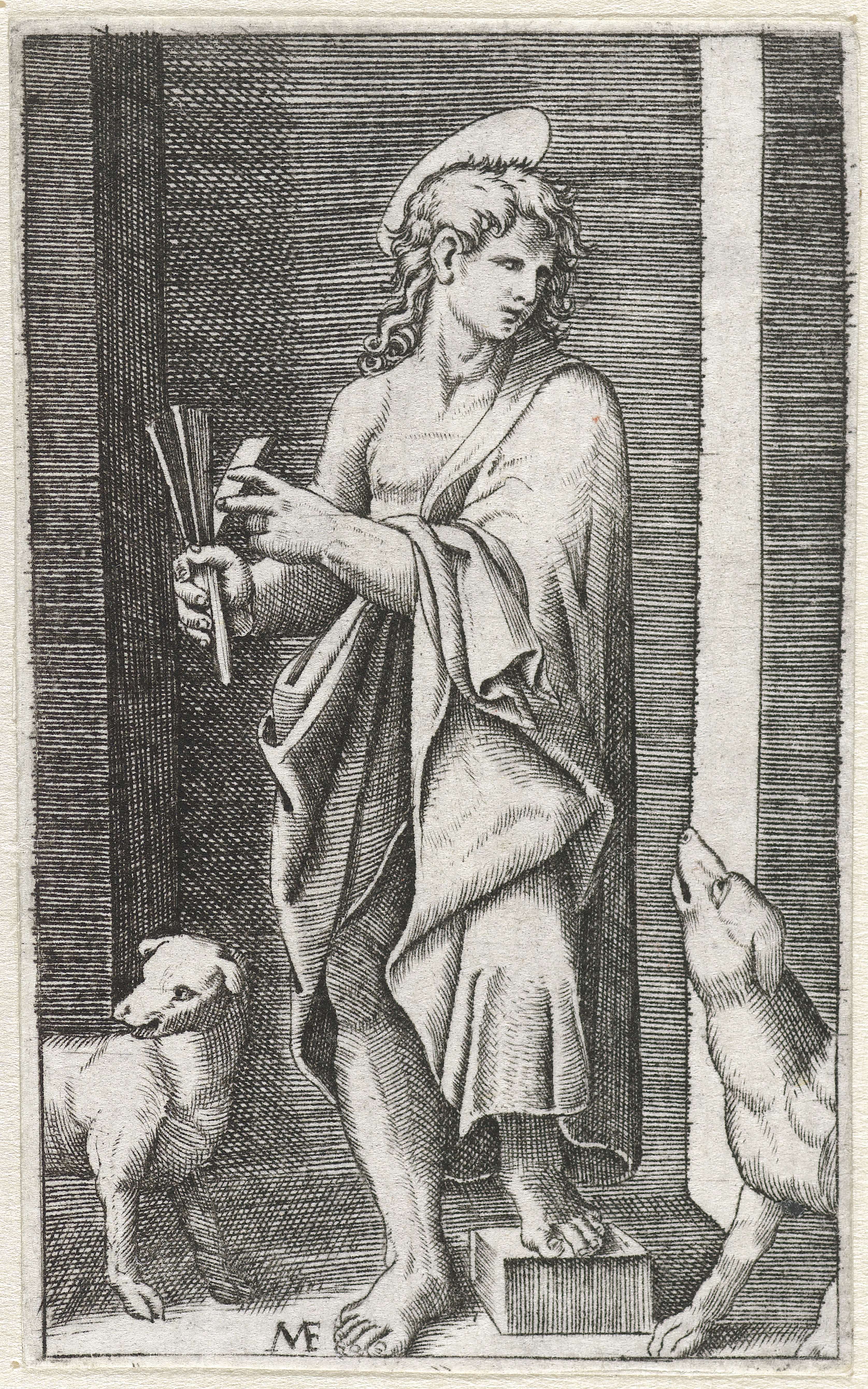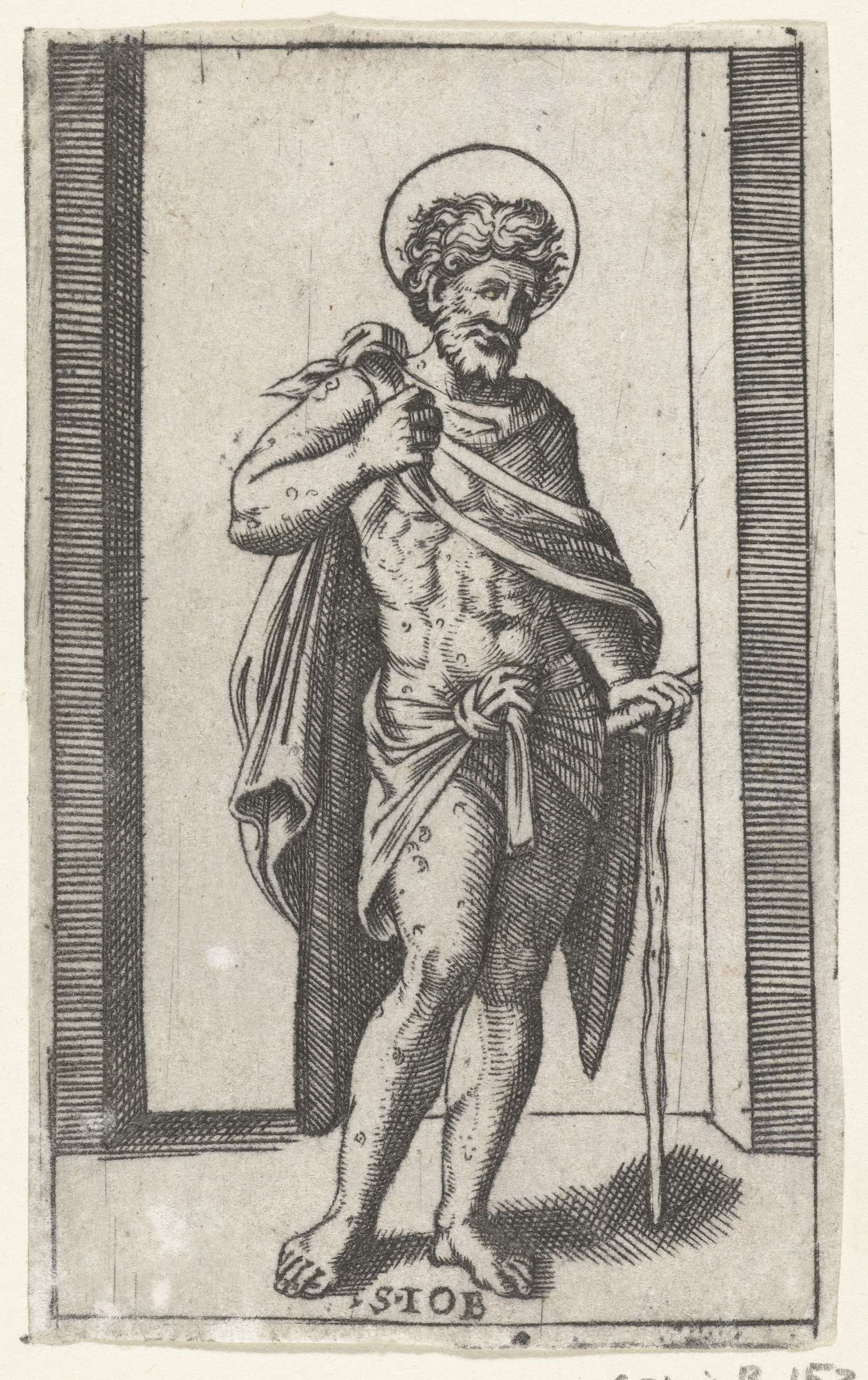 Heilige Rochus als pelgrim met pelgrimsstaf toont pe...