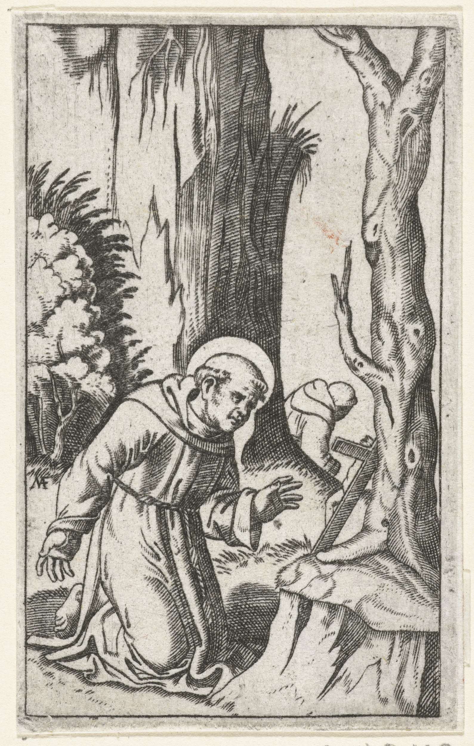 Heilige Franciscus van Assisi knielend voor crucifix