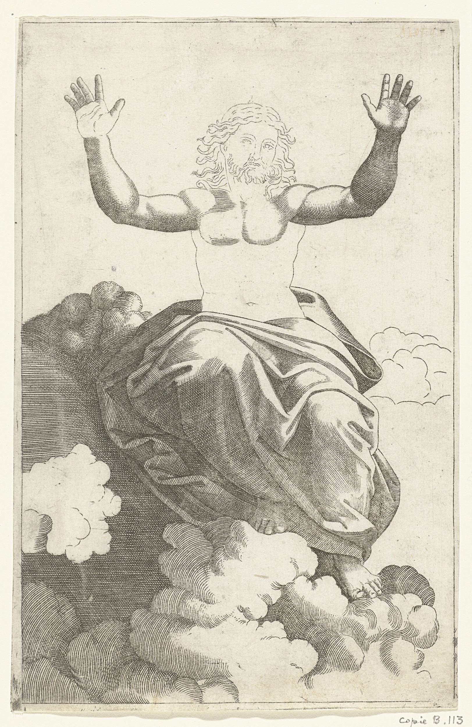 Christus zittend op wolken met opgeheven armen