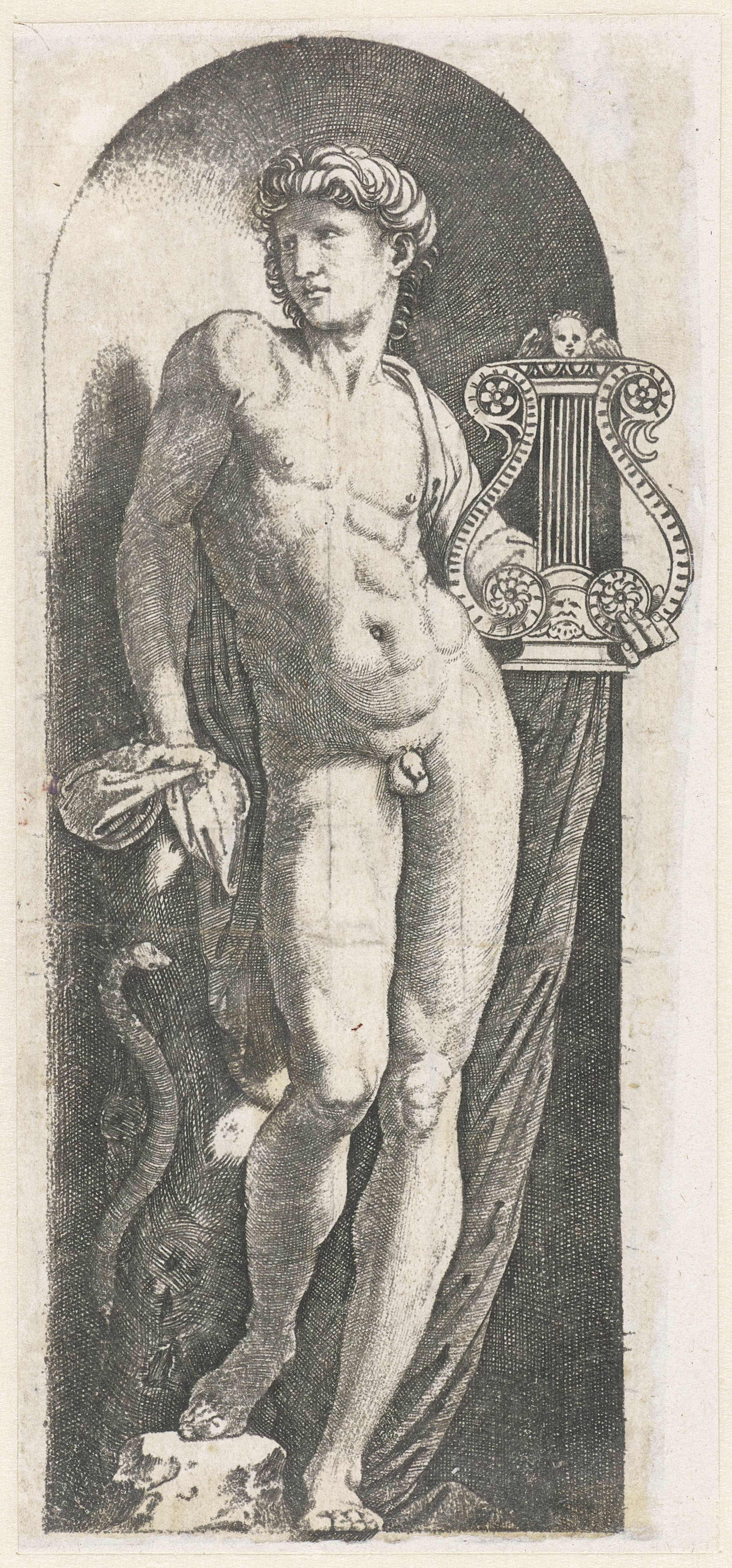 Apollo met harp staand in nis