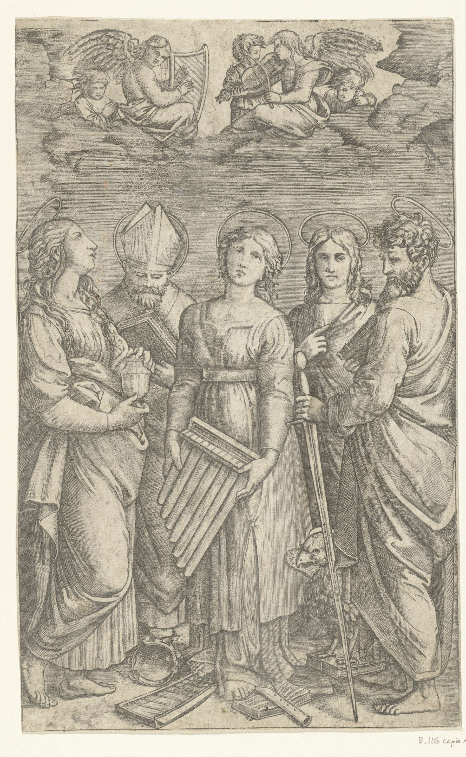 Heilige Cecilia met muziekinstrumenten omringd door ...