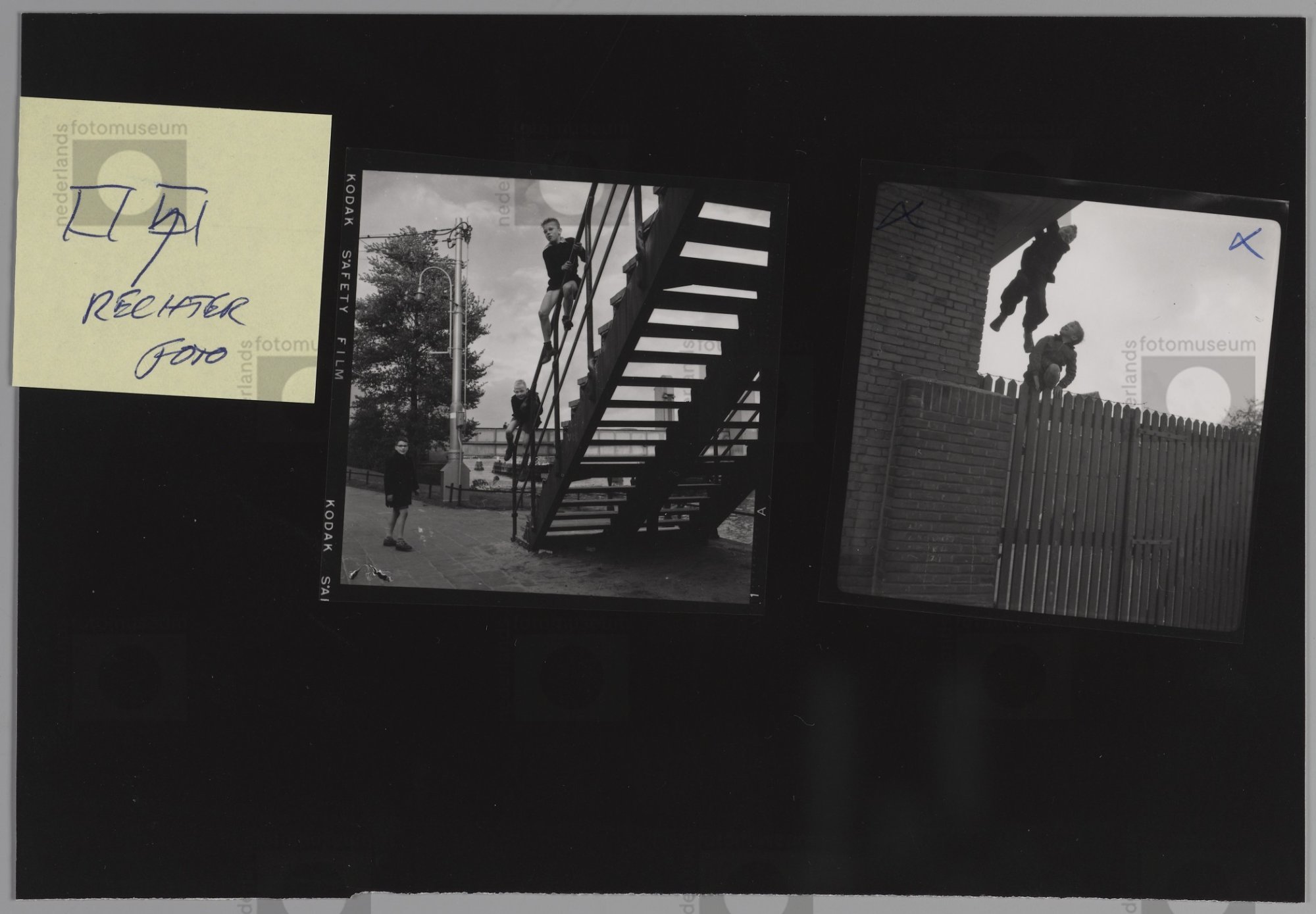 Amsterdam. Twee jongens klauteren op een houten hek,...