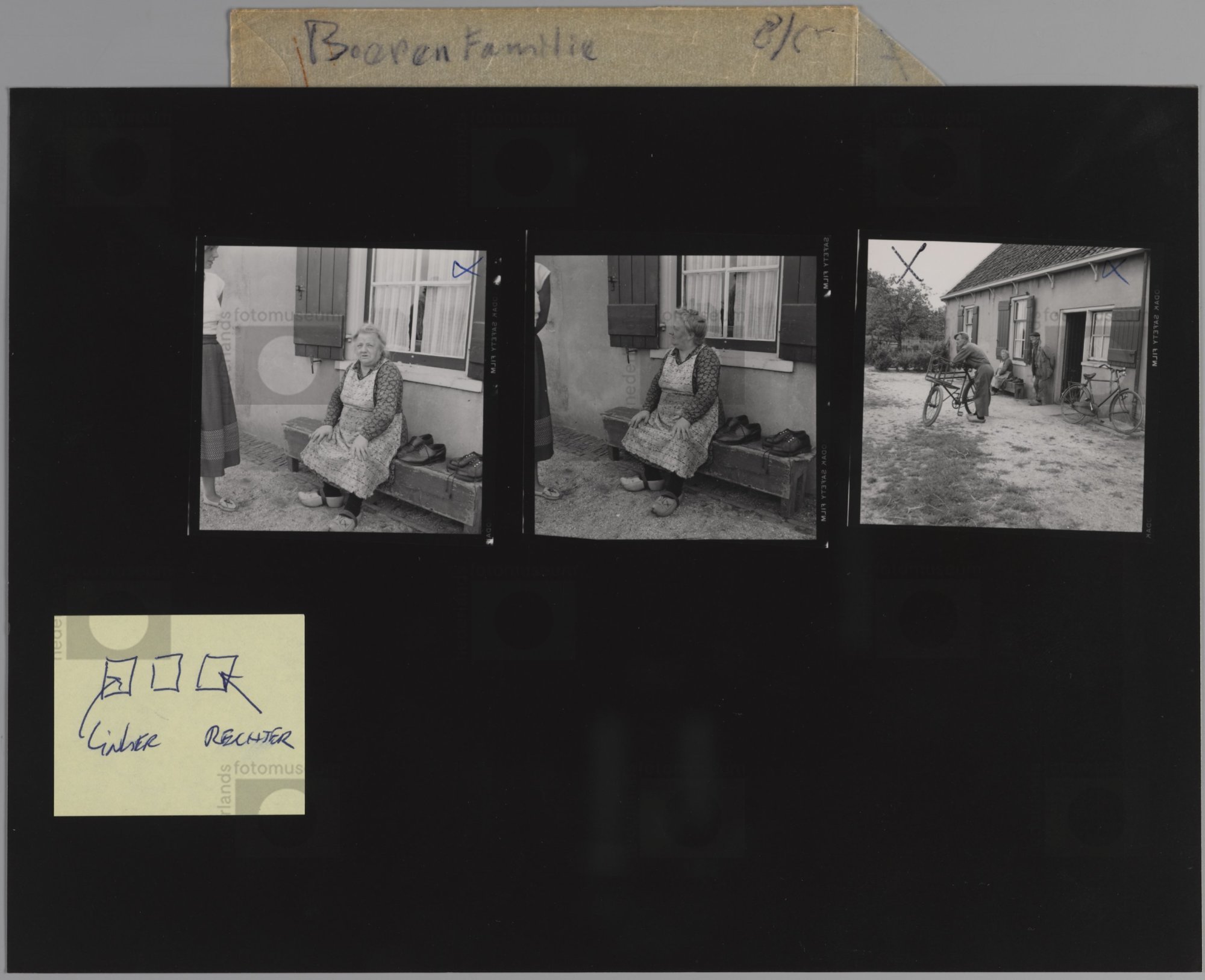 Boerenfamilie met klompen aan zit voor de deur te ki...