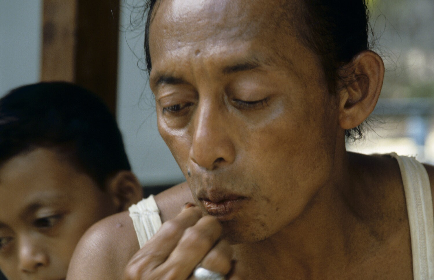Portret van een meloen-etende jongen. Bali.