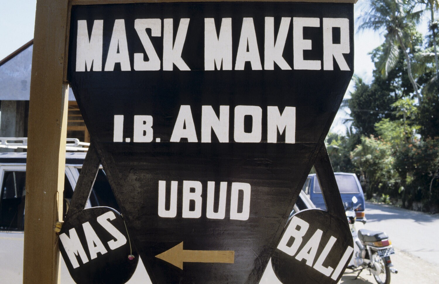 Uithangbord van het atelier van maskermaker Ida Bagu...