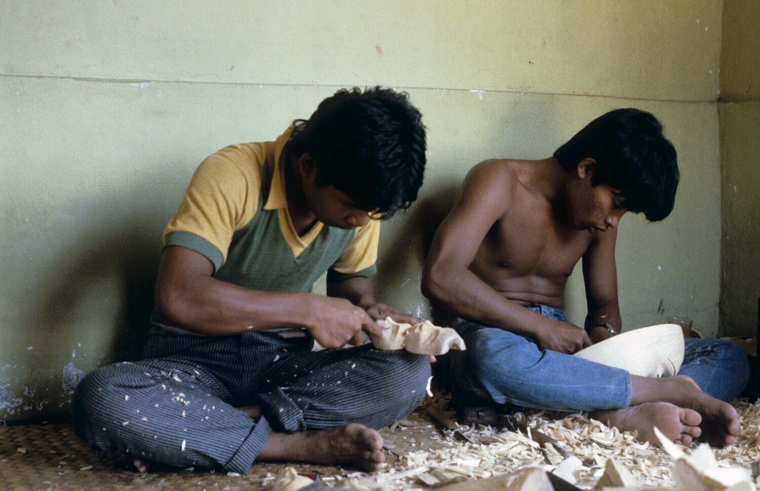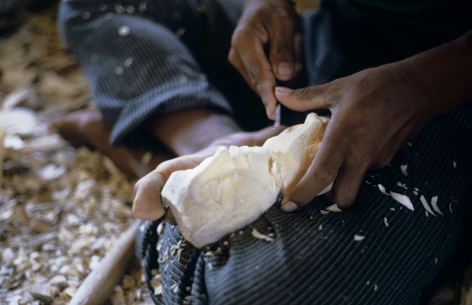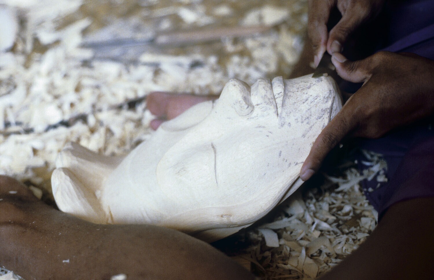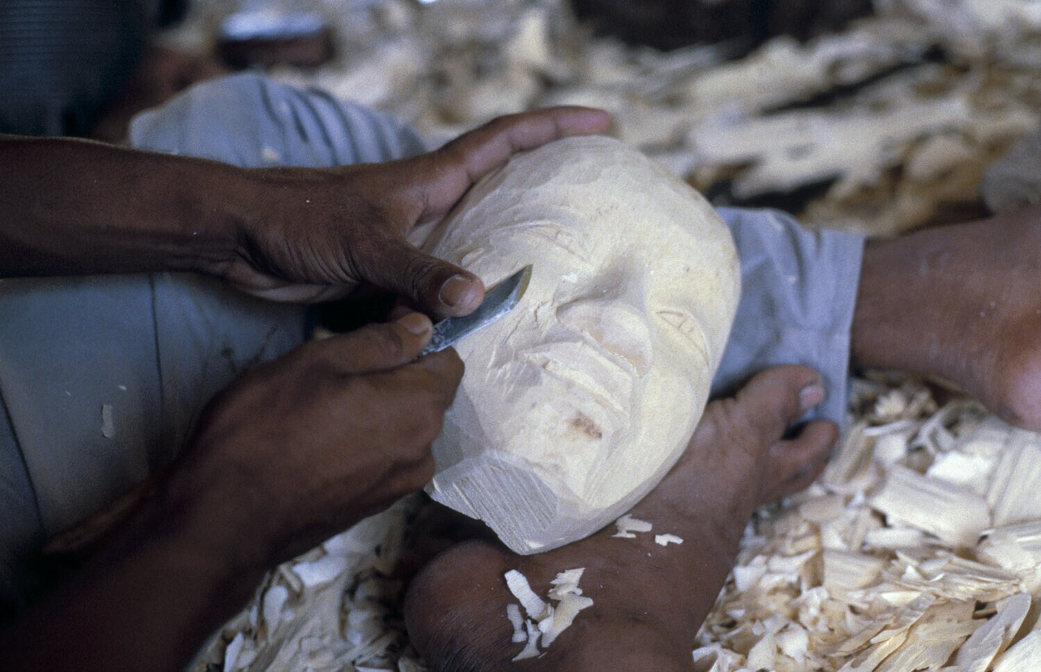 Woodcarver making a mask in the workshop of Ida Bagu...