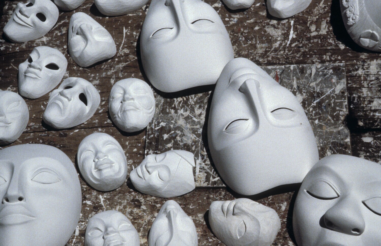 White masks drying in the workshop of mask maker Ida...