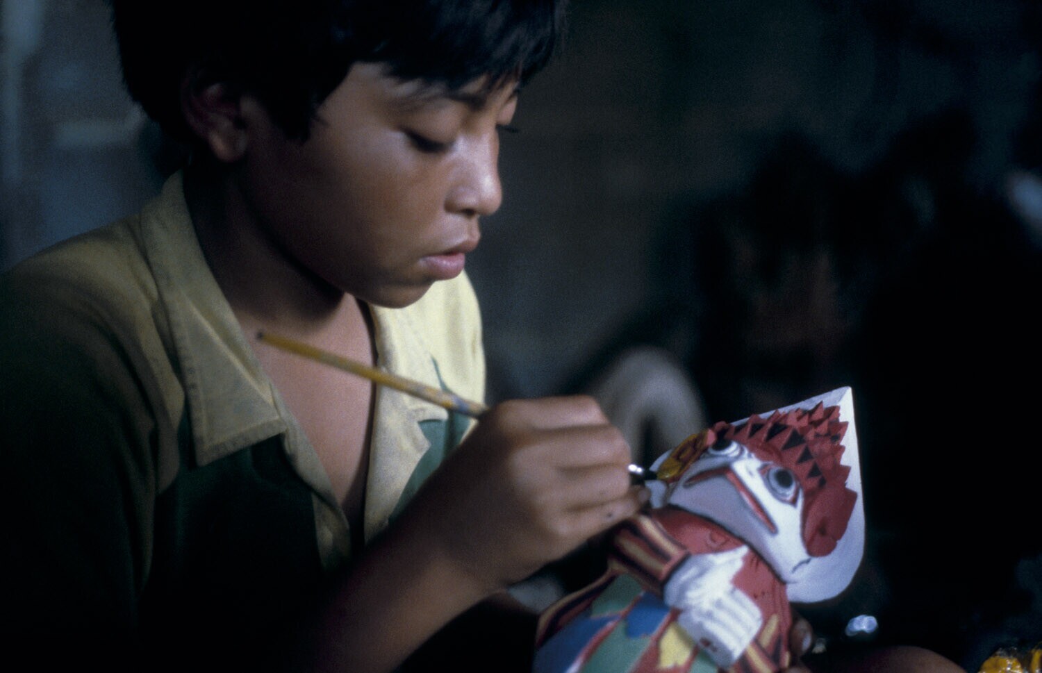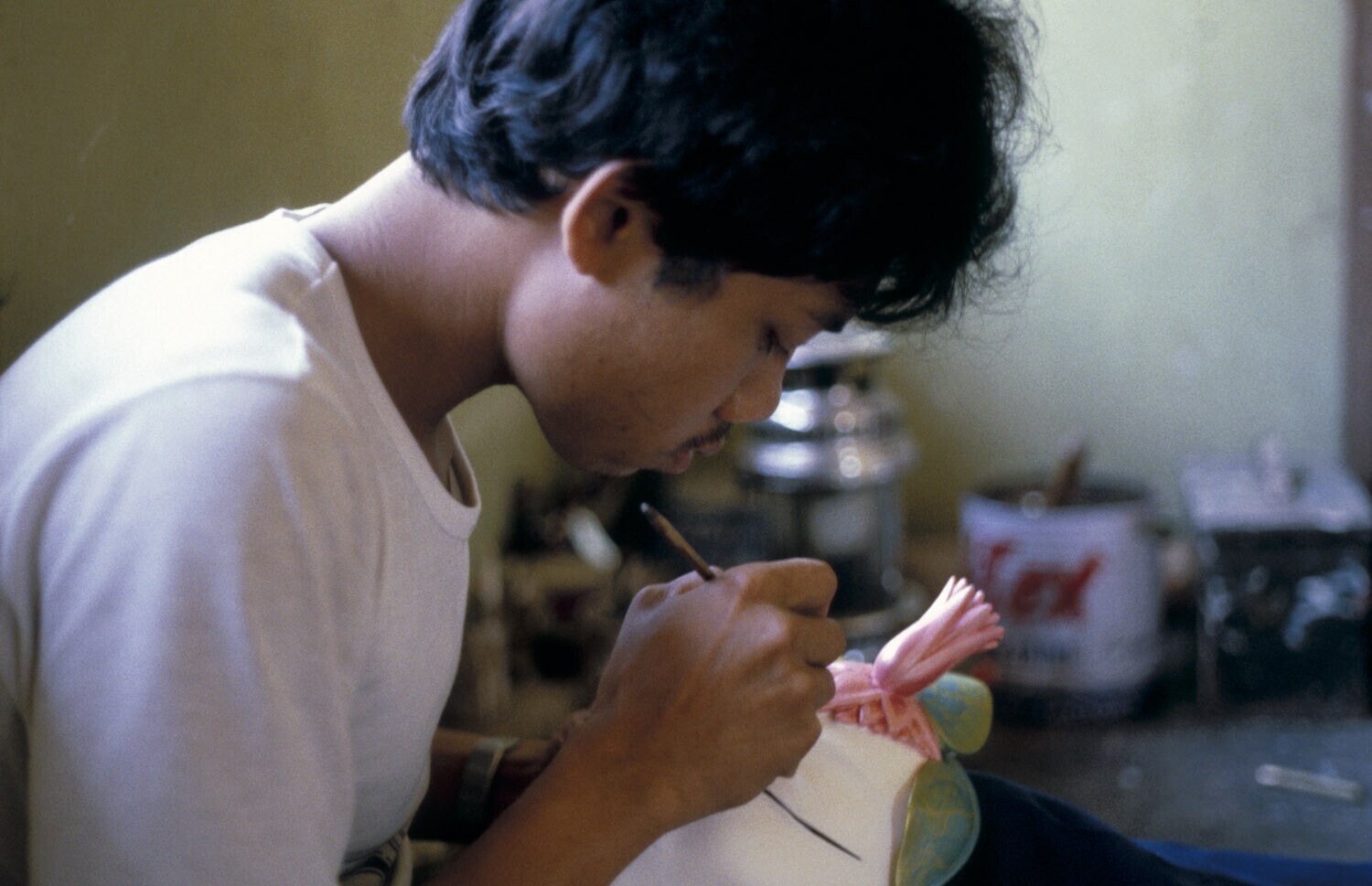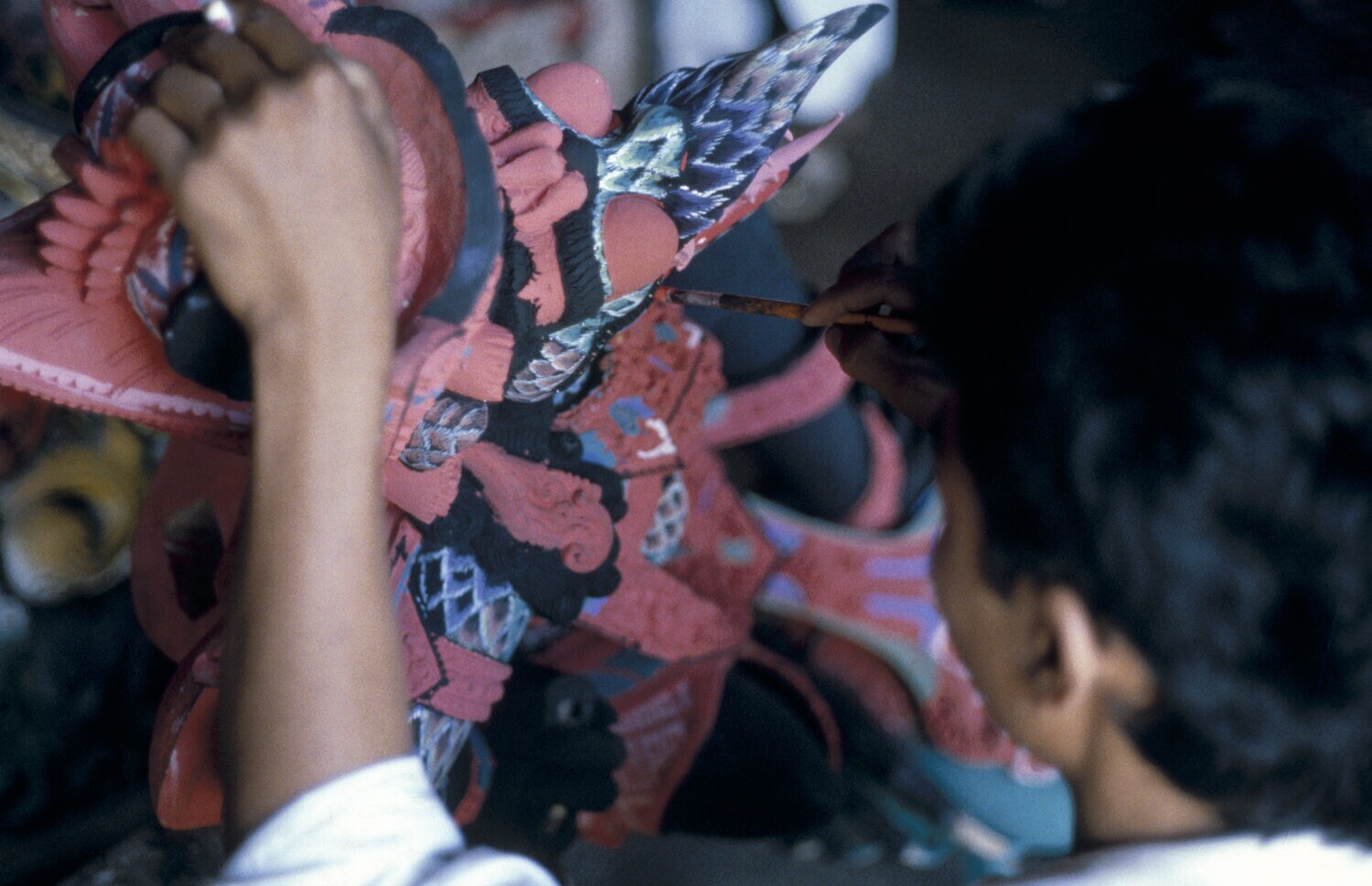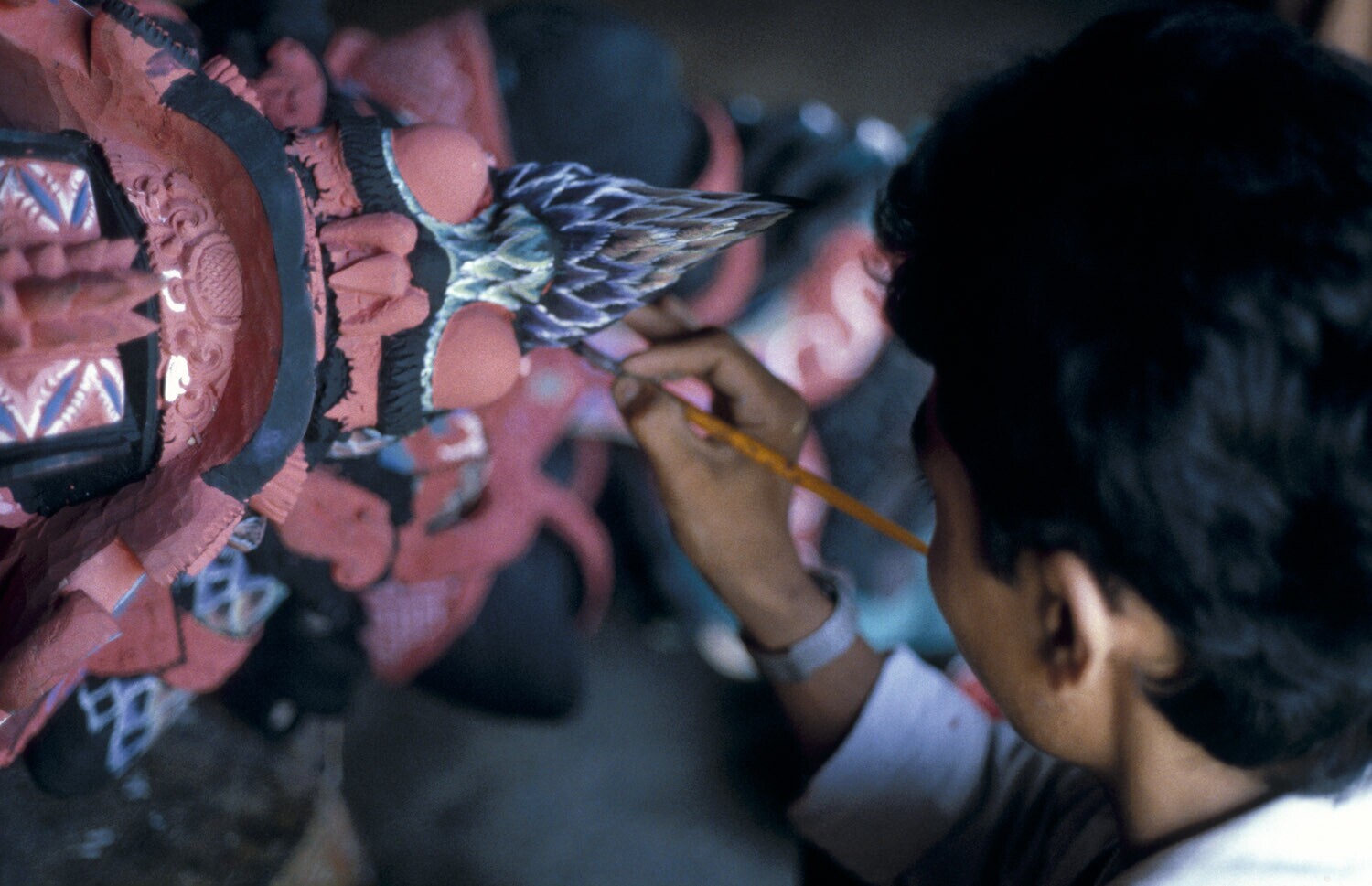 Painting a carved object in the workshop of mask mak...